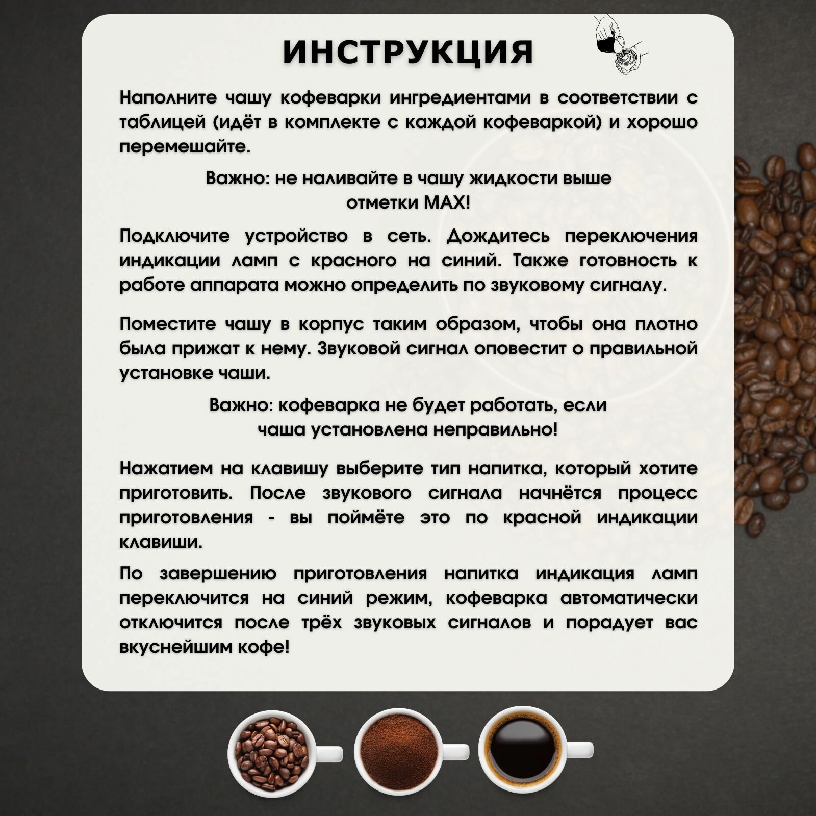 | Кол-во приготовляемых чашек кофе, шт | 3 |