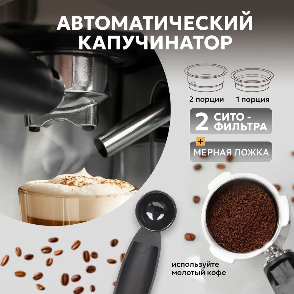 | Комплектация | Кофеварка, сито-фильтр для кофе (на 1 чашку), сито-фильтр для кофе (на 2 чашки), рожок кофеварки, мерная ложка-темпер. |