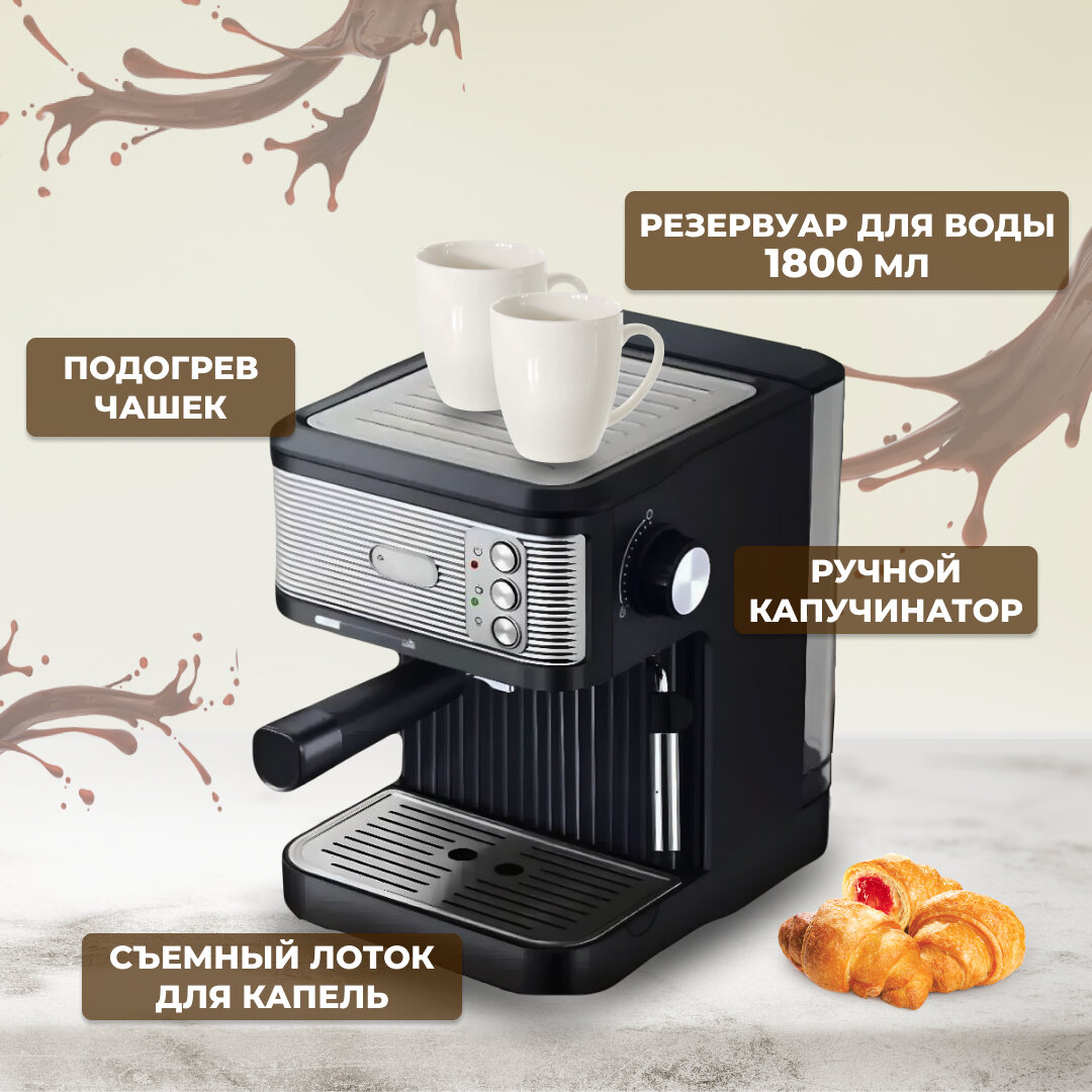 10 цен на Кофемашина TIFFANY TF-1619, рожковая с капучинатором, мощность 1350 Вт, давление 20 бар, черная/серебристая