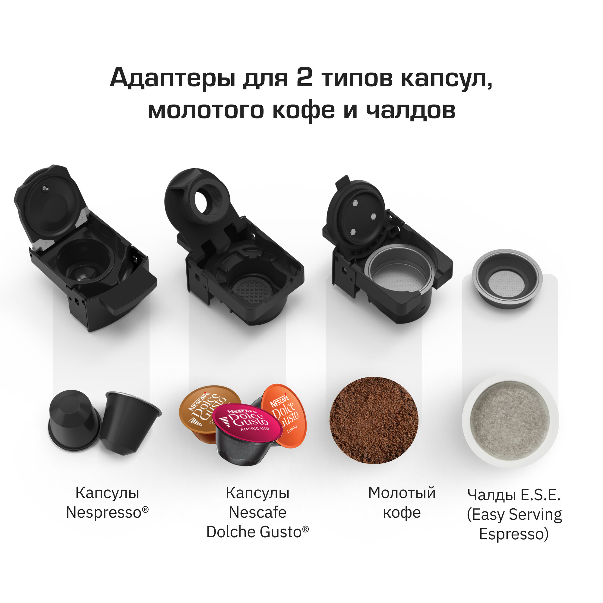 | Тип капсул | Bennoti / Bialetti / Brown / CHOGAN / Caffitaly / Cafiera / Cafissimо / Capsul'in / Cremesso / Dolce Gusto / Ecaffe / INTO Caffe / Illy / Lavazza / Lavazza BLUE / Lavazza LEP / Lespresso / Linospresso / Nespresso Original / Nespresso Professional / Nespresso Vertuo / Paulig Cupsolo / Polti / Smart Coffee Club Livorno / Squesito / Tassimo / Tchibo / Zepter / Zespresso |