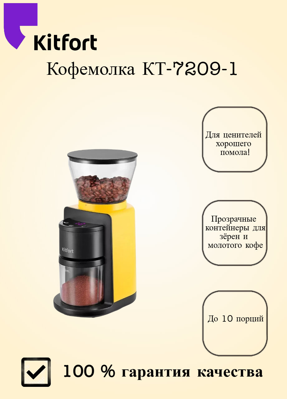 Отзывы на Кофемолка Kitfort KT-7209-1, жерновая система помола, 180Вт, черно-желтая, 210г