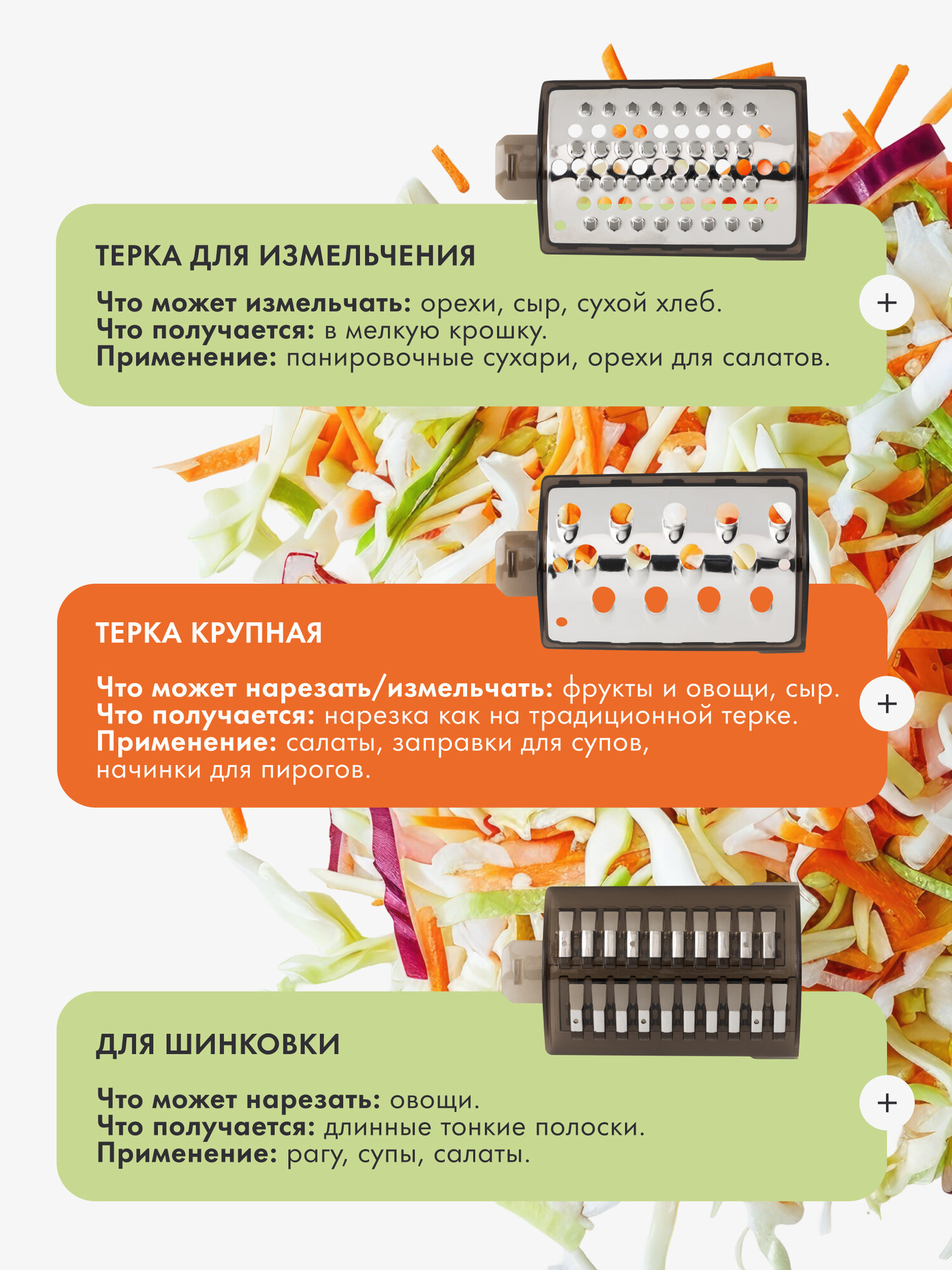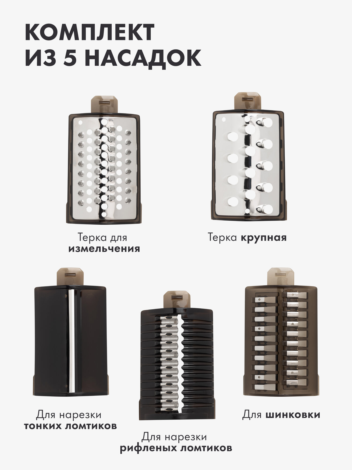 | Насадки | для нарезки ломтиками, для нарезки соломкой, насадка-терка |