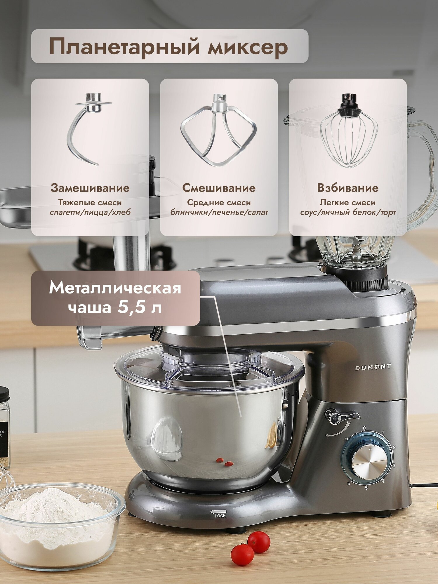 Кухонная машина Dumont DMSM-2004, 6 скоростей, чаша 5,5 л, чаша блендера - стекло информация: