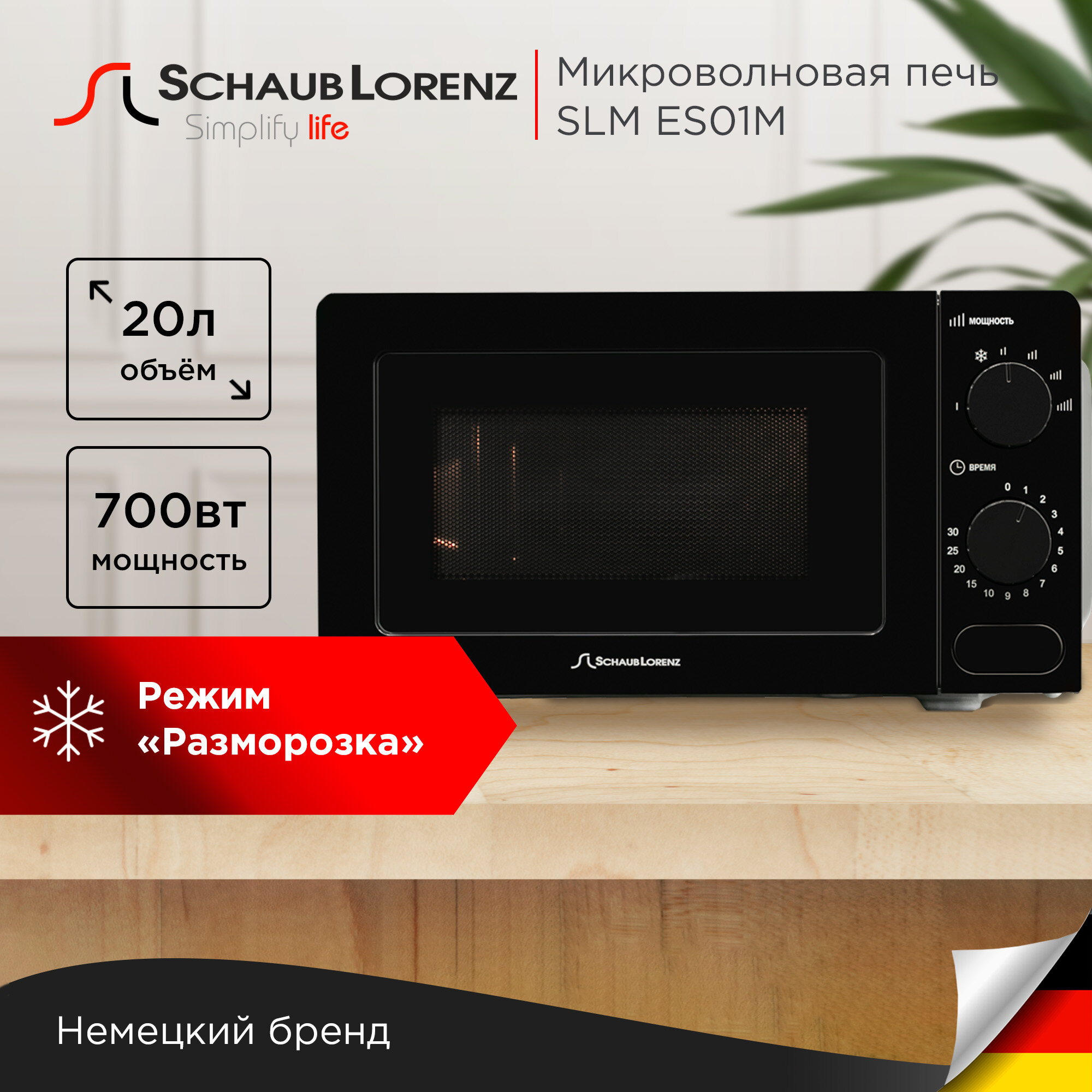 Микроволновая печь Schaub Lorenz SLM EW01D, 20 литров, дисплей, 700 Вт, 6 режимов, кнопка.