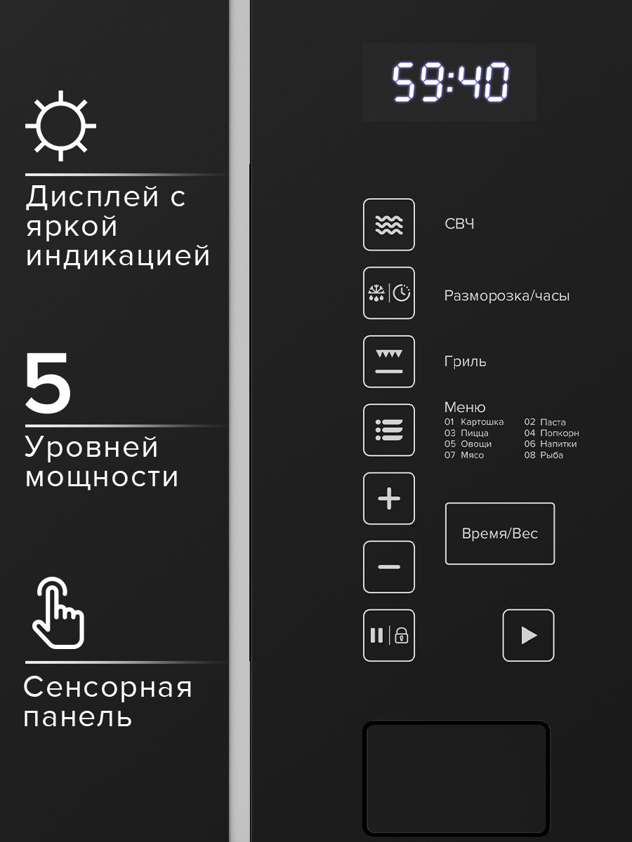 | Режимы работы | гриль / микроволны + гриль / разморозка |