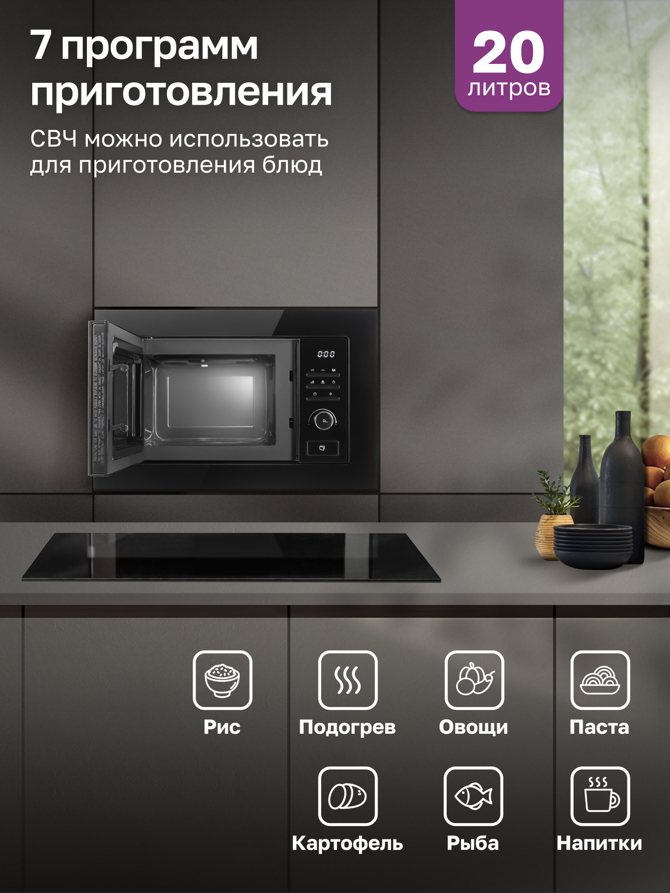 Встраиваемая микроволновая печь GARTZ MВB271B SmartCook, 20 л, 800Вт, 7 программ, дисплей, гриль, авторазморока, черная информация: