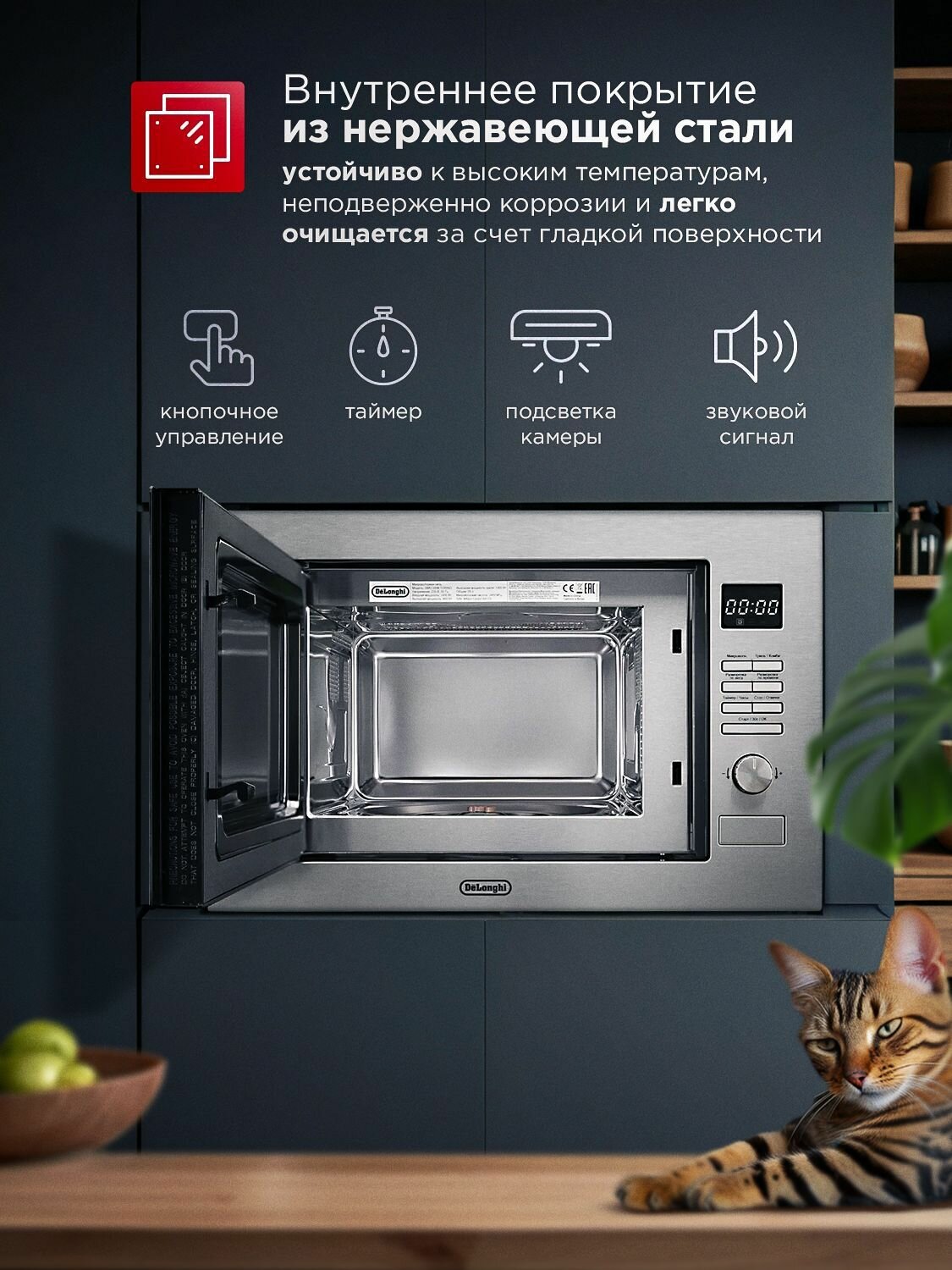 Встраиваемая микроволновая печь DeLonghi Roma DMO 25NB, 25л, электронное управление,1450Вт, 8 автопрограмм