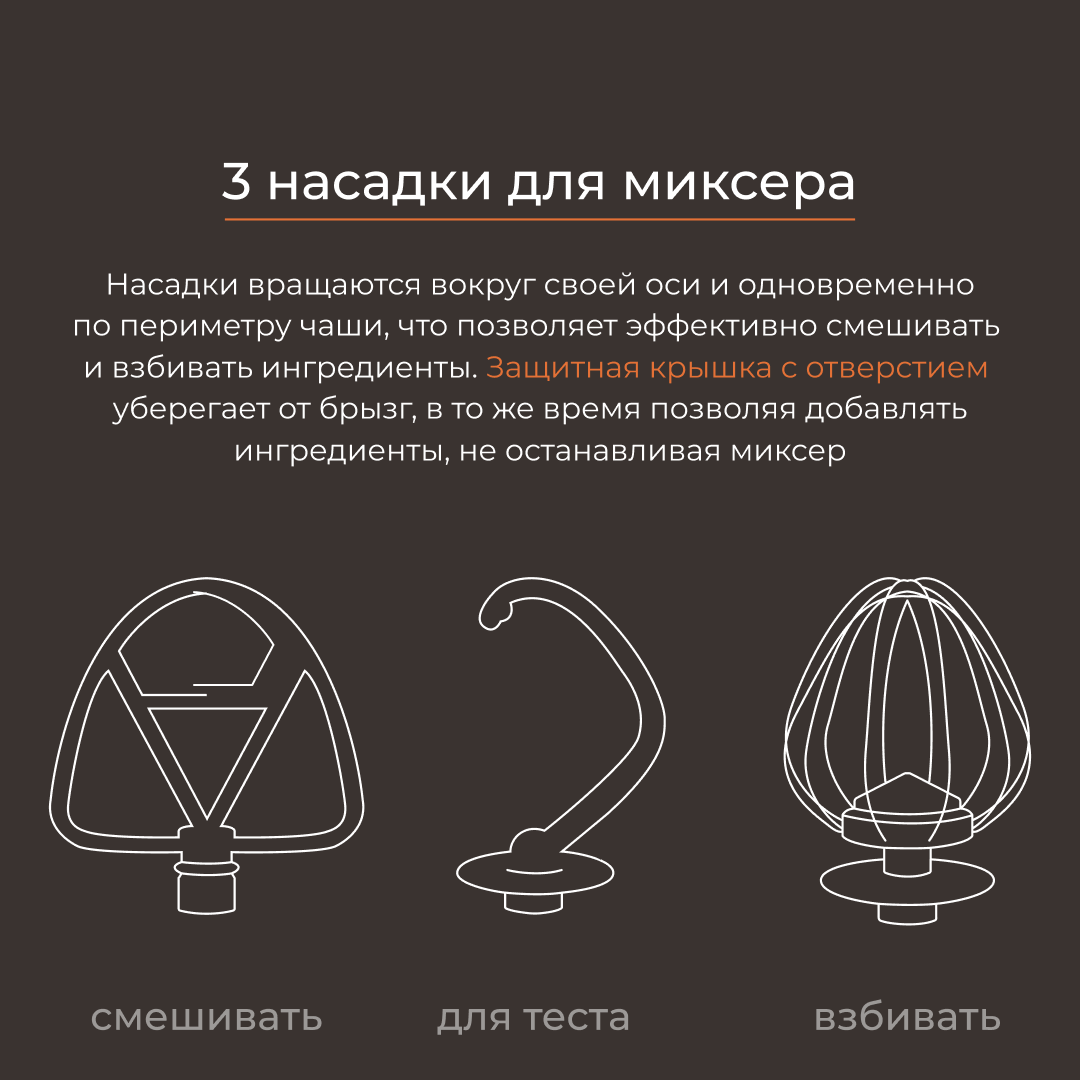 | Насадки | венчик для взбивания / крючки для замешивания теста / лопатка / Для взбивания молочной пенки |