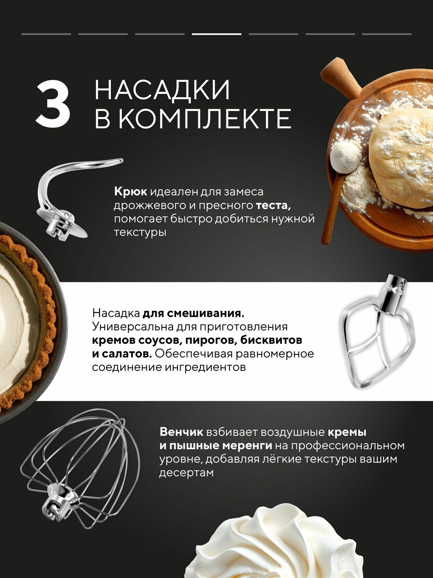 | Насадки | венчик для взбивания / крючки для замешивания теста / лопатка / насадка-блендер / Мясорубка |