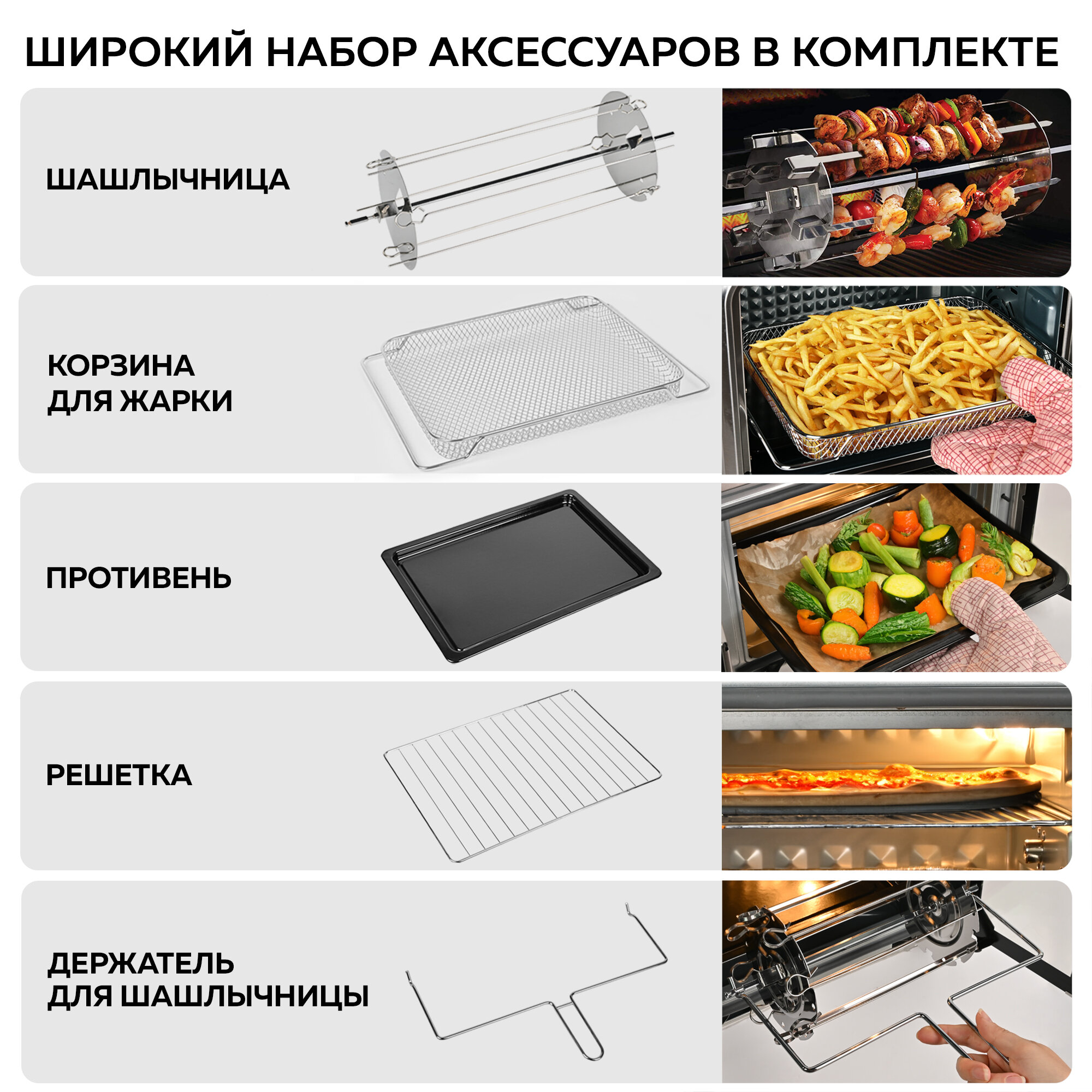 | В комплекте | поддон для сбора крошек, противень, держатель вертела (шашлычницы), корзина для фритюра, мини-печь, решетка для запекания, шашлычница |