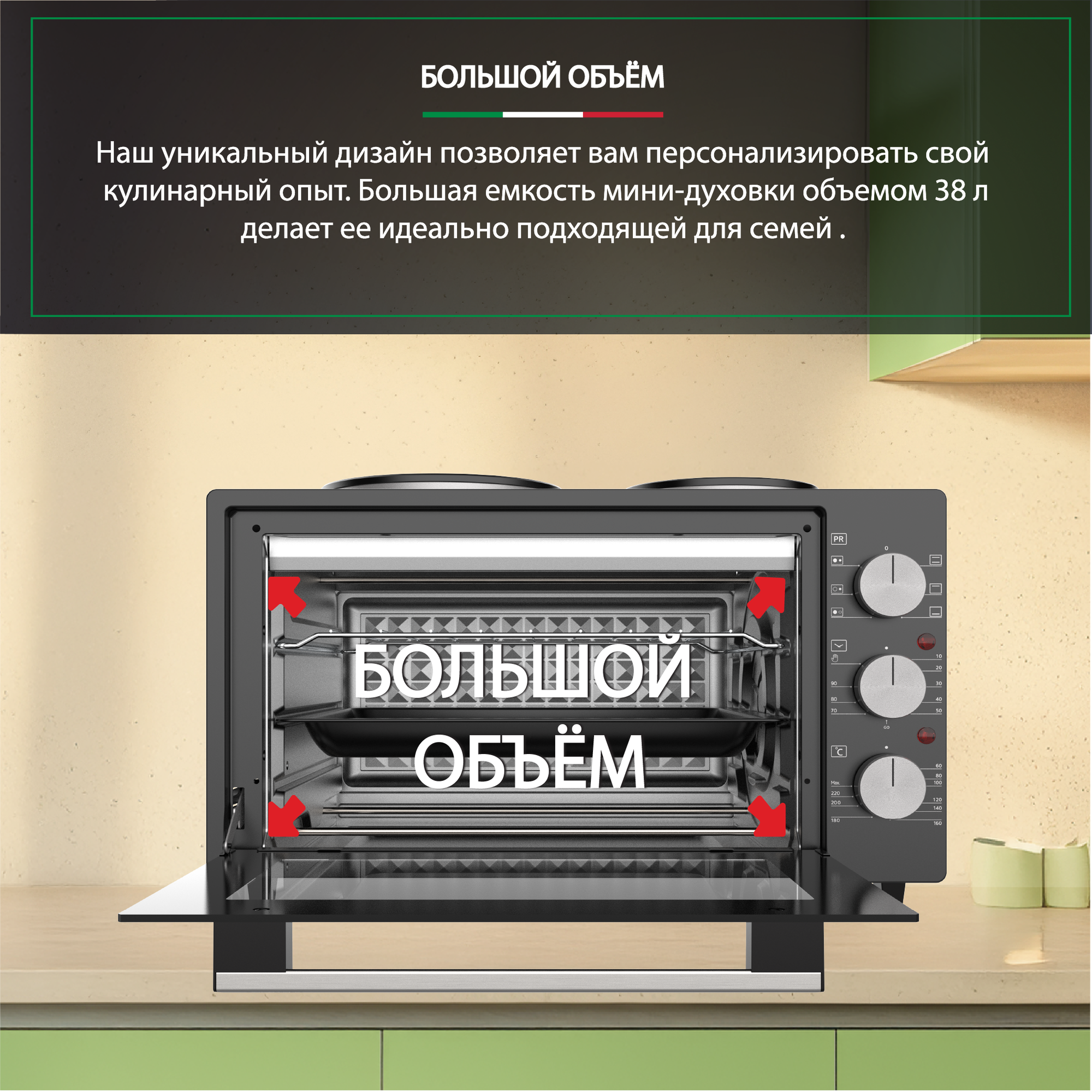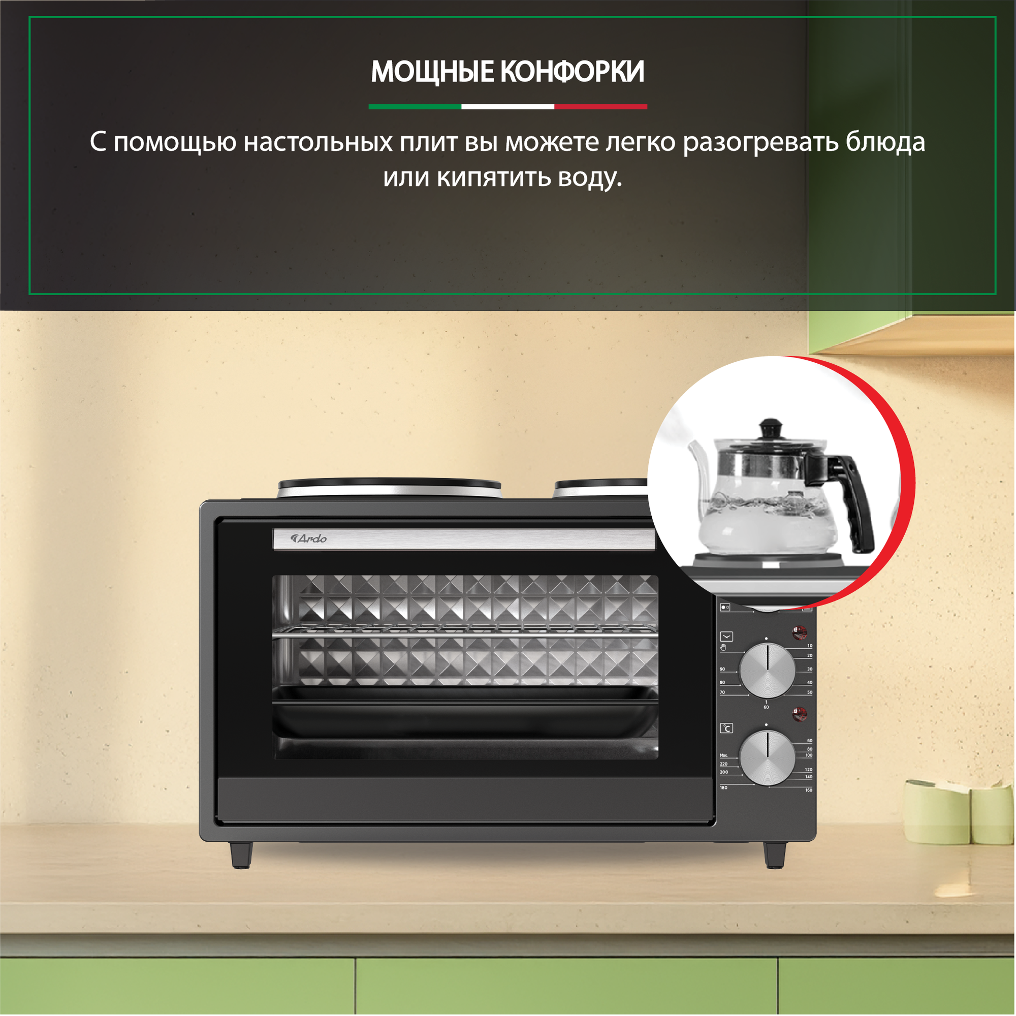 Мини-печь Ardo 38 литров с 2 конфорками, 3 режима, 2 противня + хромированная решетка, механический таймер информация: