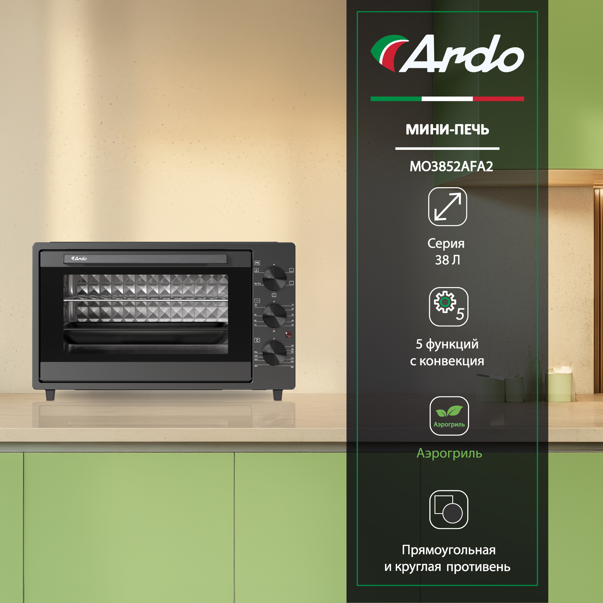 Мини-печь Ardo 5 режимов, конвекция, аэрогриль, дегидратор, турбовентилятор 38 л, 2 противня + решетка, таймер информация: