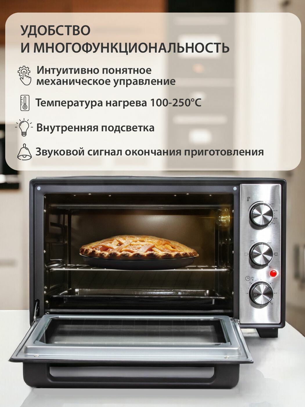 Отзывы на Мини-печь электрическая 32л с КОНВЕКЦИЕЙ Pioneer MO5016G, 5 режимов нагрева, подсветка внутри, таймер до 60 мин, 1600 Вт