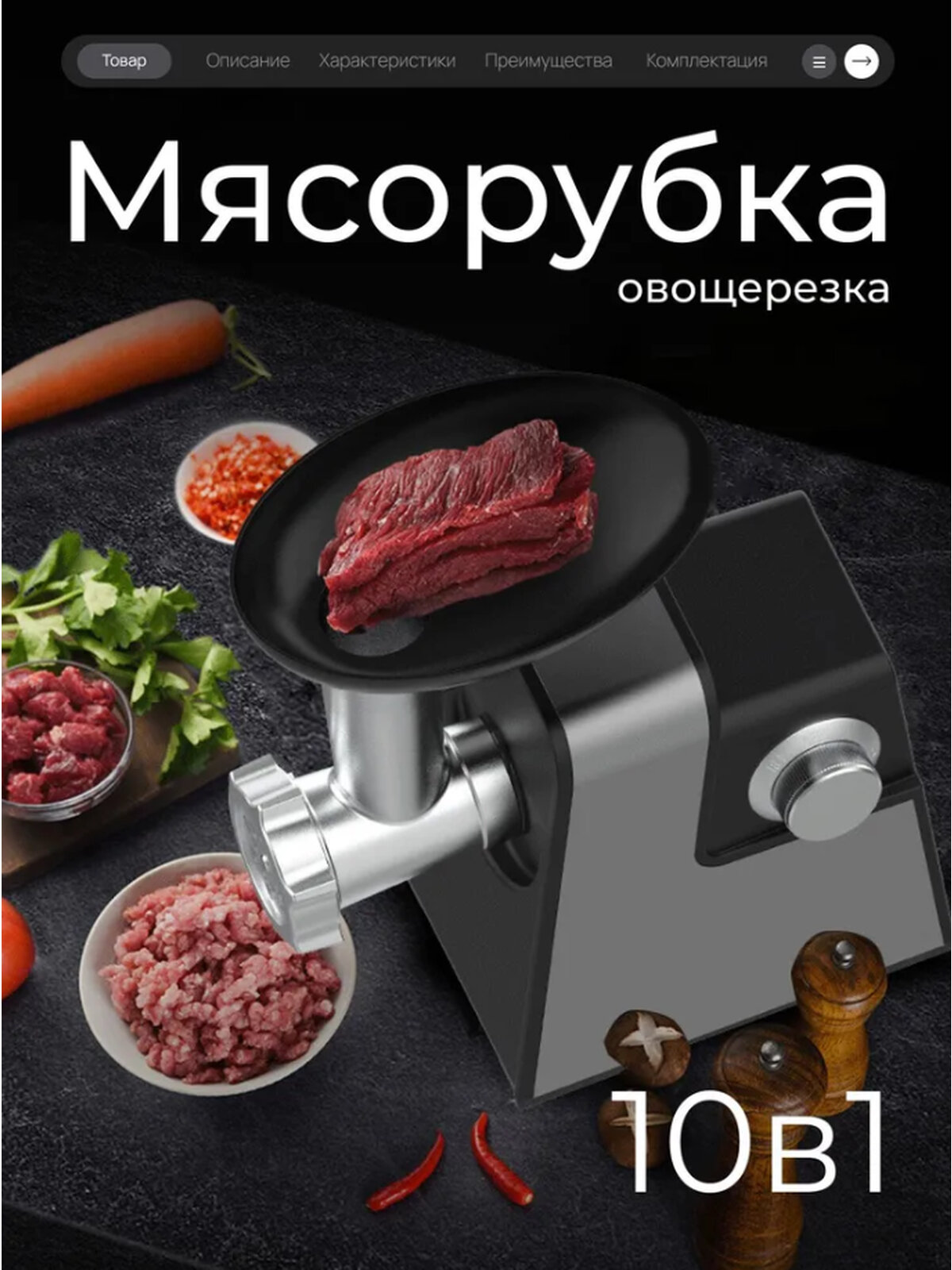 | Насадки | диск для фарша / насадка для кеббе / насадка для приготовления колбас / насадка для шинковки / насадка-терка |