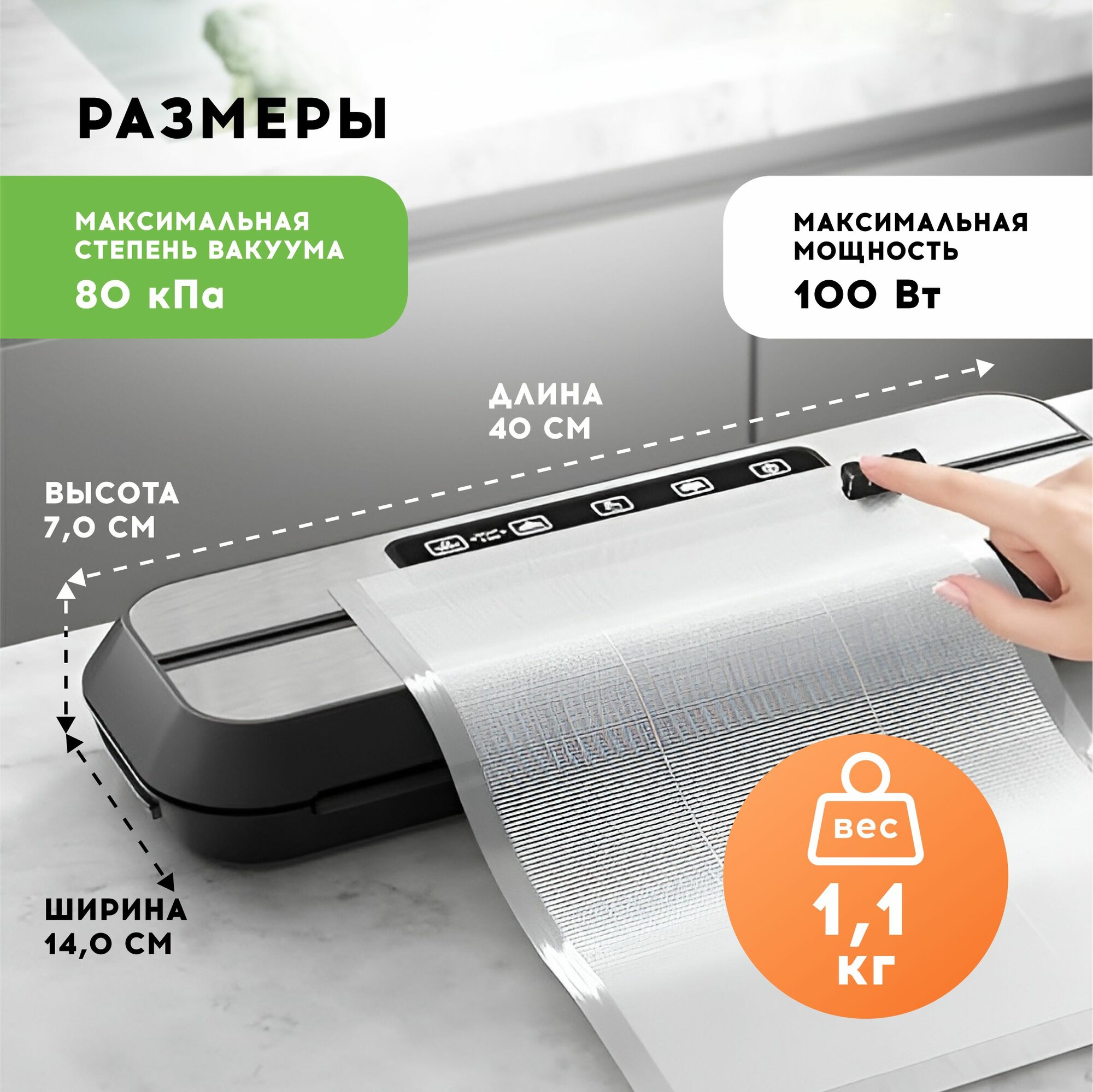 | Особенности | Адаптер для уплотнения контейнера, Встроенный резак для пакетов, Выбор режима для сухих и влажных продуктов, Работа с ёмкостями |