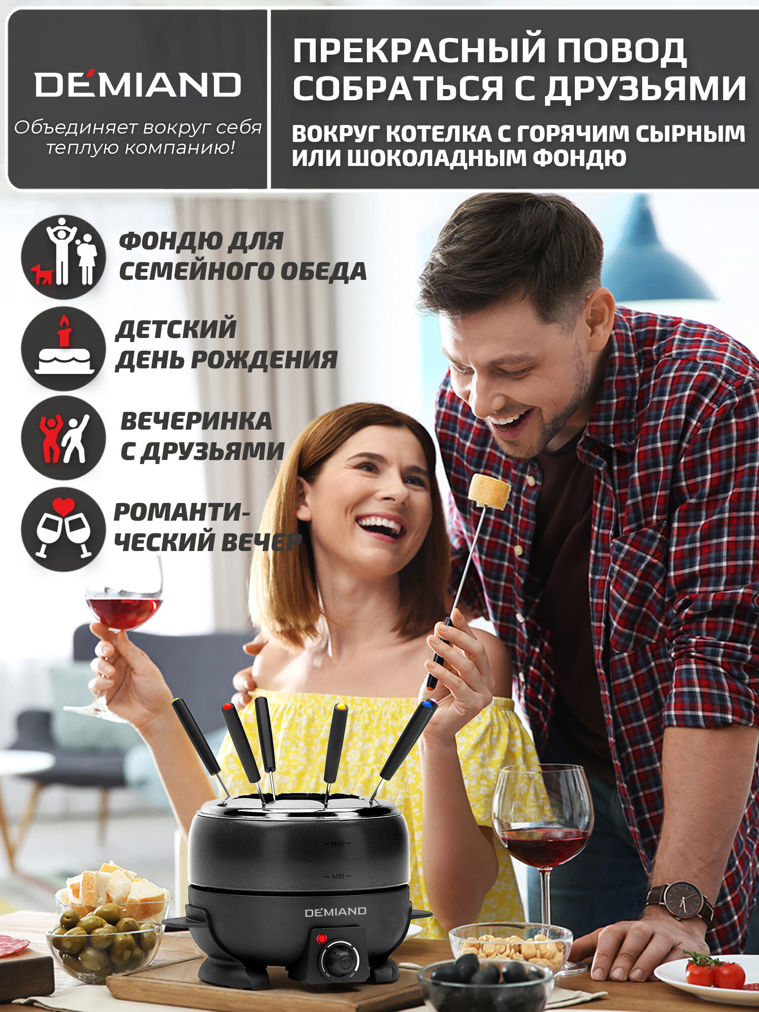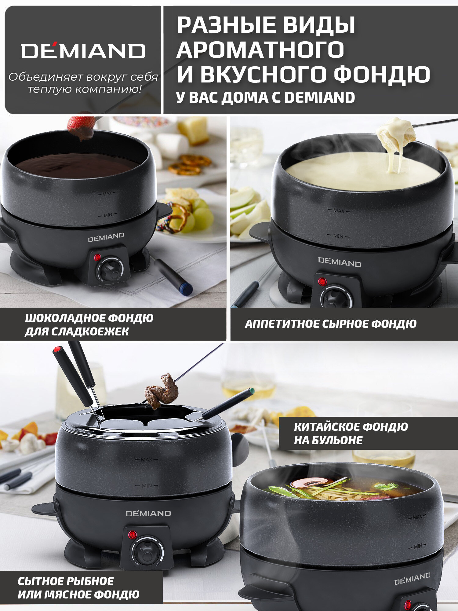 Отзывы на Фондю электрическое Professional DEMIAND для сыра и шоколада, кастрюля с антипригарным покрытием,2л,6 вилок, книга с рецептами,800 Вт, FD-2000