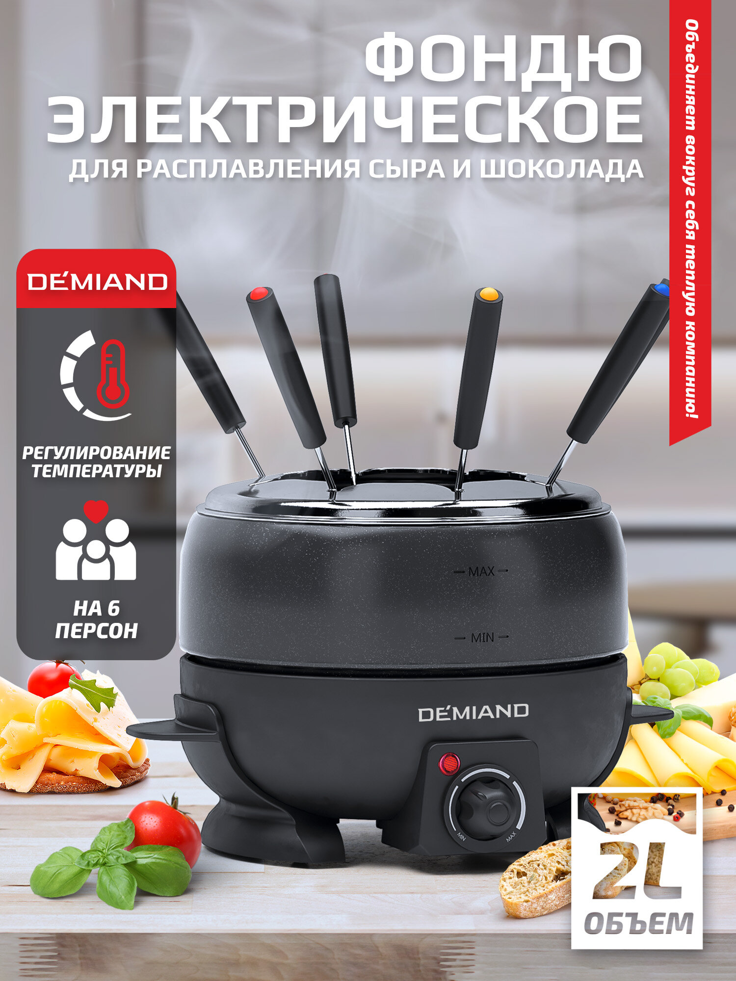 Фондю электрическое Professional DEMIAND для сыра и шоколада, кастрюля с антипригарным покрытием,2л,6 вилок, книга с рецептами,800 Вт, FD-2000 информация: