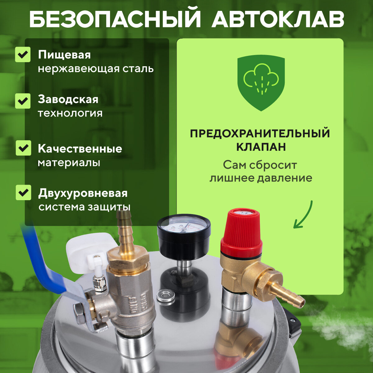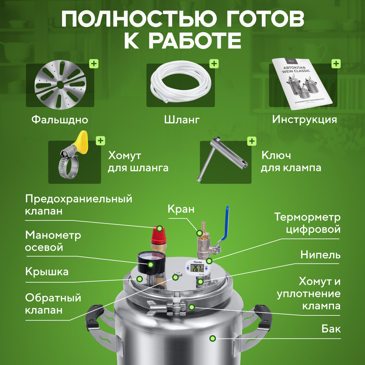 | Подробная комплектация | Емкость автоклава, крышка, фальшдно, уплотнение клампа, хомут клампа, ключ для клампа, кран, штуцер, манометр, термометр, предохранительный клапан, зажим для термометра, обратный клапан, хомут для шланга, шанг, инструкция |