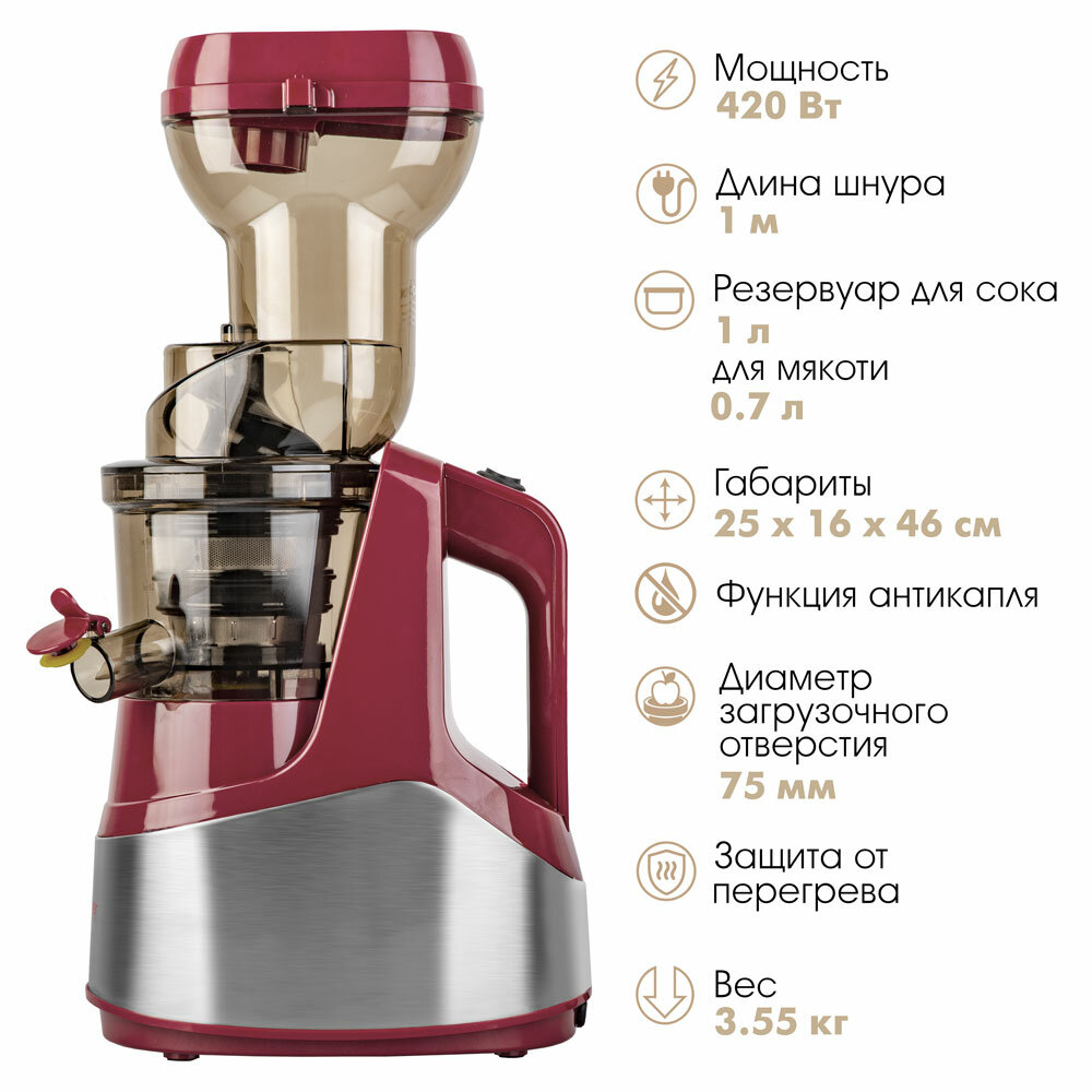 | Дополнительная информация | выход сока до 85%, холодный прессовый отжим, 100% сохранение витаминов |