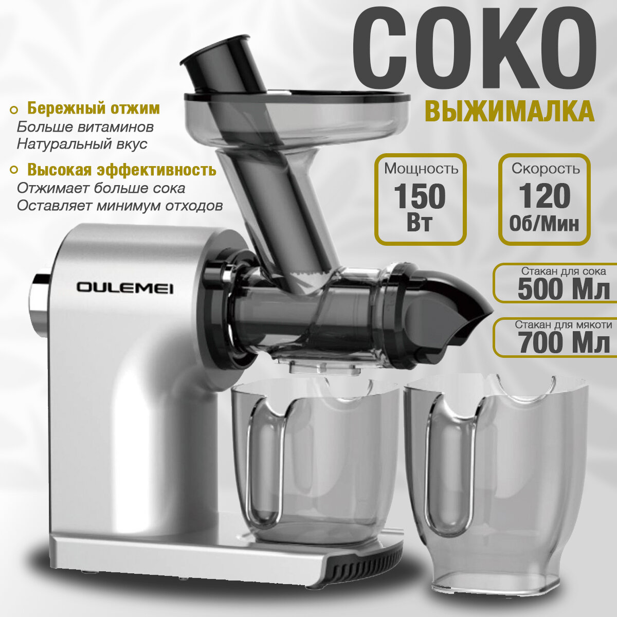 Соковыжималка шнековая Oulemei YZA003, 2 скорости, система "капля-стоп", плавный запуск, серебристый/черный информация:
