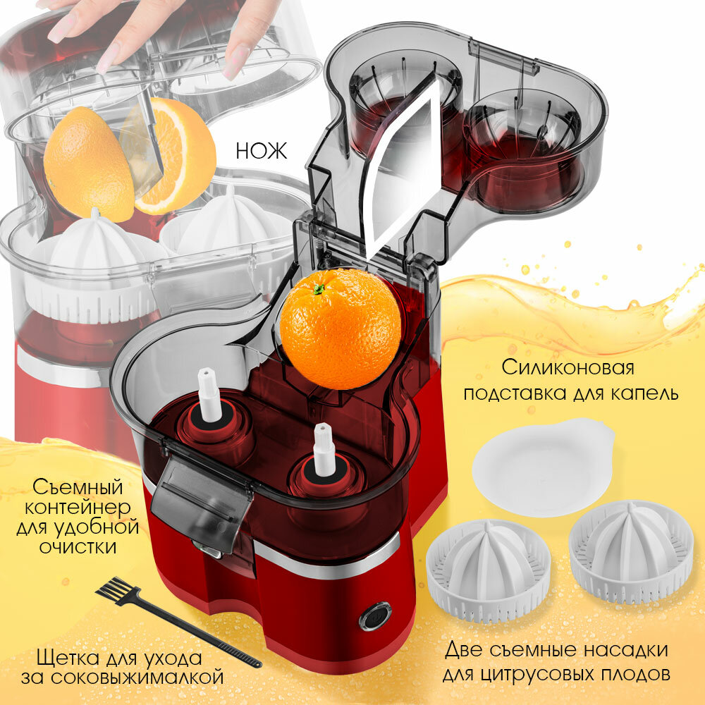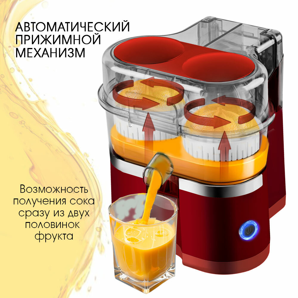 | Особенности | автоматический прижимной механизм / возможность получения сока сразу из двух половинок фруктов / специальная силиконовая подставка для капель |