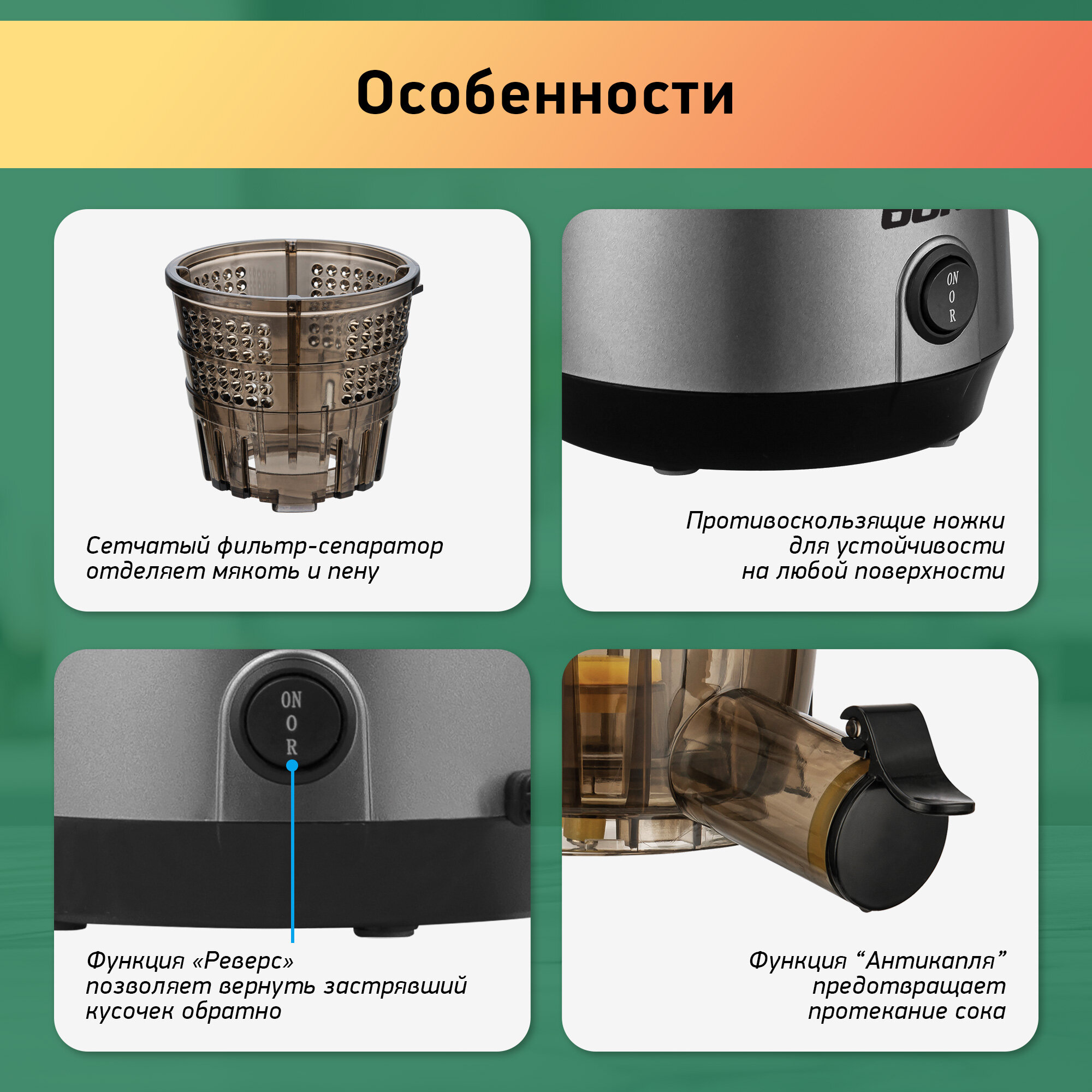 Соковыжималка BBK JCS100 черный/серый, шнековая, функция антикапля, мощность 150 Вт информация: