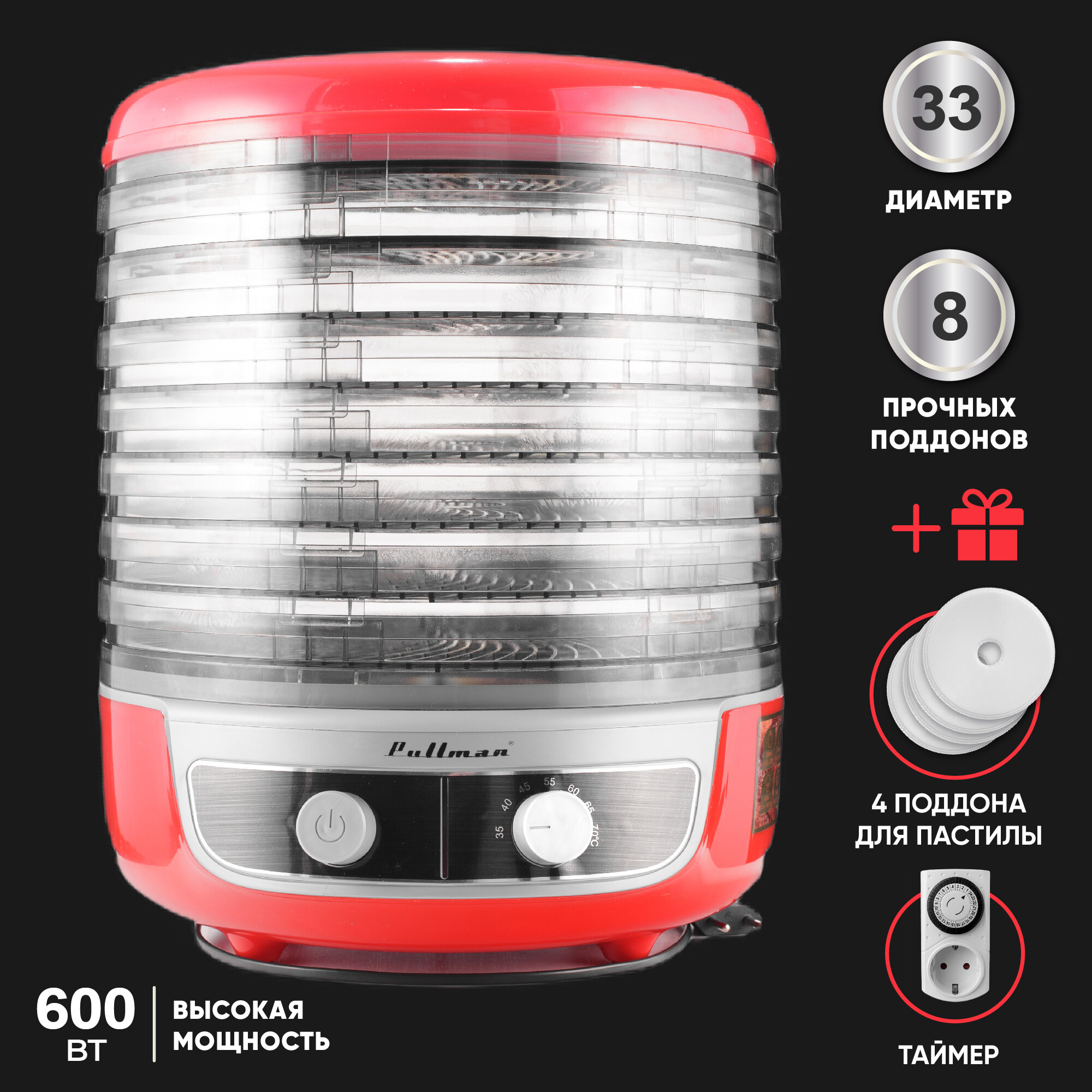 Отзывы на Сушилка для овощей и фруктов Pullman PL-2281 Т, дегидратор/электрическая 8 поддонов и 4 поддона для пастилы+таймер в подарок