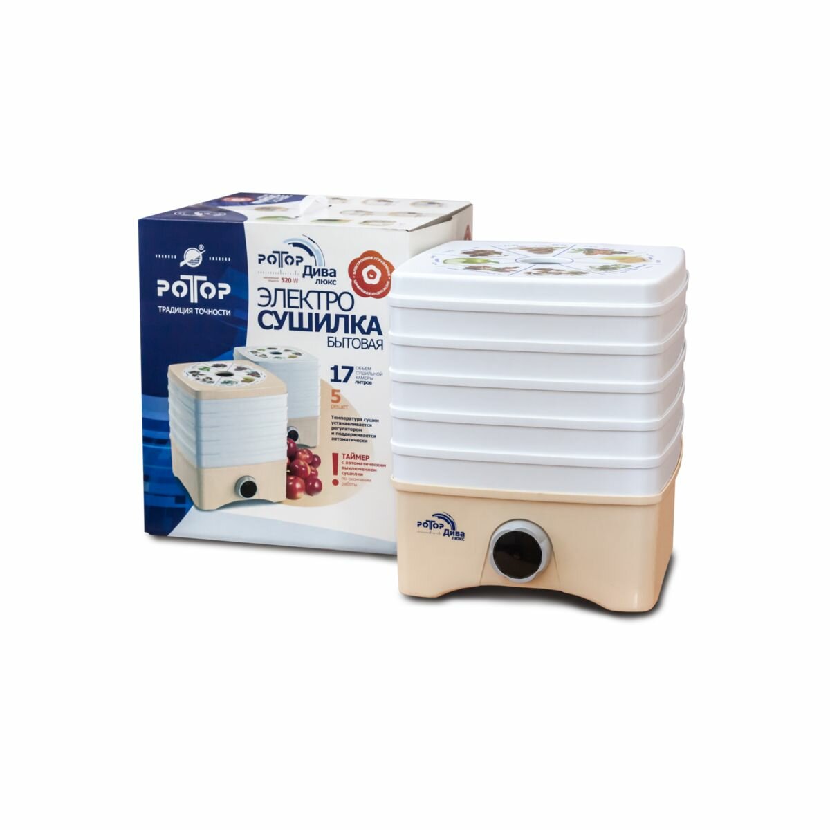 Сушилка для овощей и фруктов Ротор-Дива-Люкс 5 поддонов, электронное управление, цветная упаковка