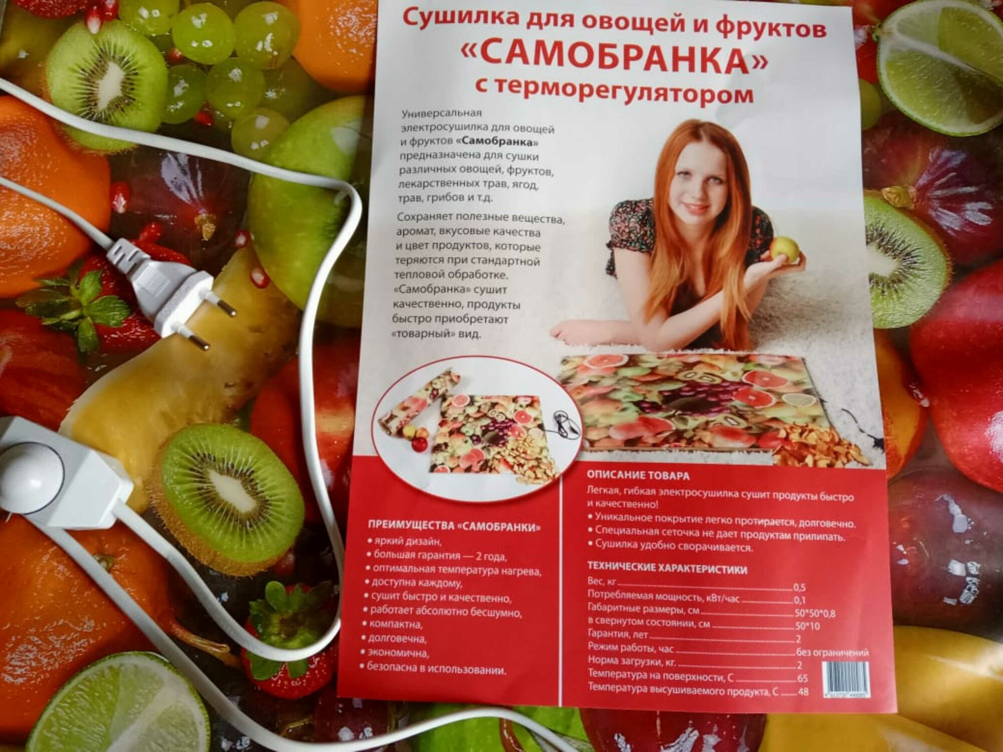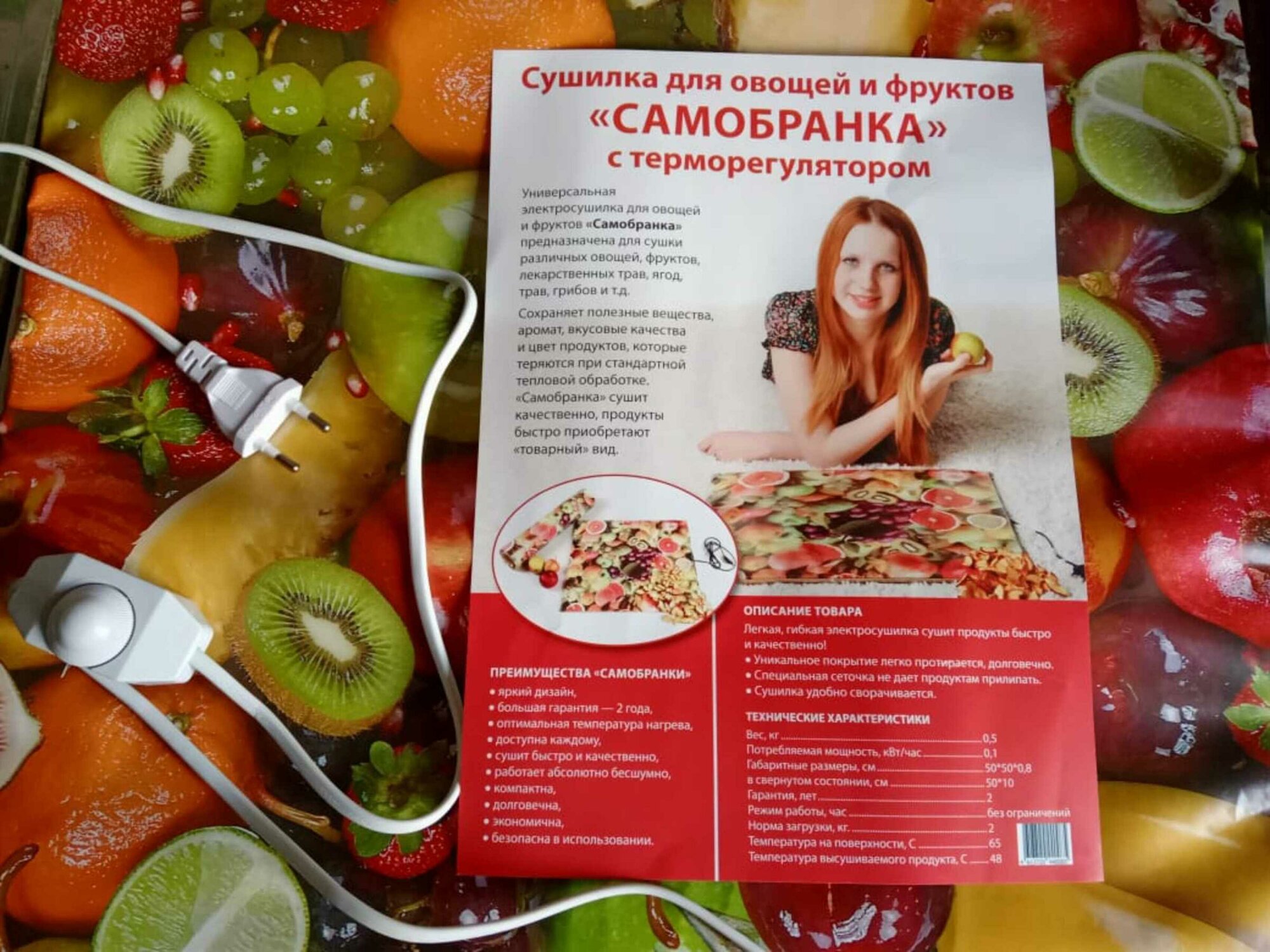 | Дополнительная информация | Сушилка инфракрасная универсальная Самобранка 50x50 см для приготовления пастилы, сушки рыбы, овощей, грибов, ягод, фруктов, орехов, трав, кореньев и продуктов. В комплектацию, книга рецептов и подробная инструкция по эксплуатации. ИК электро сушилка Скатерть Самобранка с терморегулятором для сушки фруктов и овощей производится российской фирмой Катрина. Мы много лет продаём качественное устройство напрямую от эксклюзивного изготовителя изделия. Сейчас в продаже появилось много некачественных сушилок с названием Самобранка с терморегулятором. Завод Катрина советует осторожнее относиться к предложениям покупки таких овощесушилок по "супер низким ценам". |