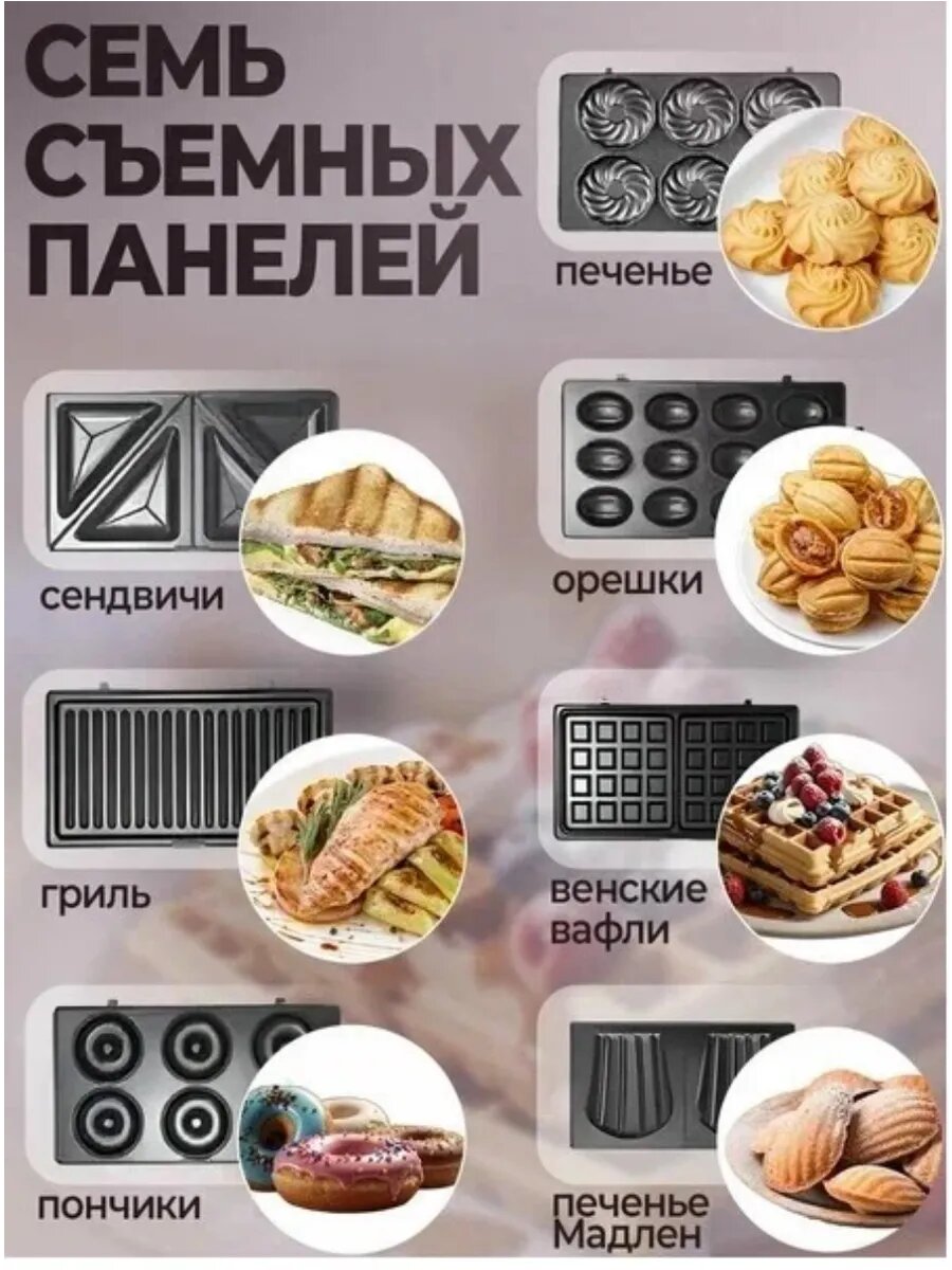 Мультипекарь со сменными панелями 7 штук (орешки, сэндвичи, вафли, пончики, печенье "улыбка") с антипригарным покрытием