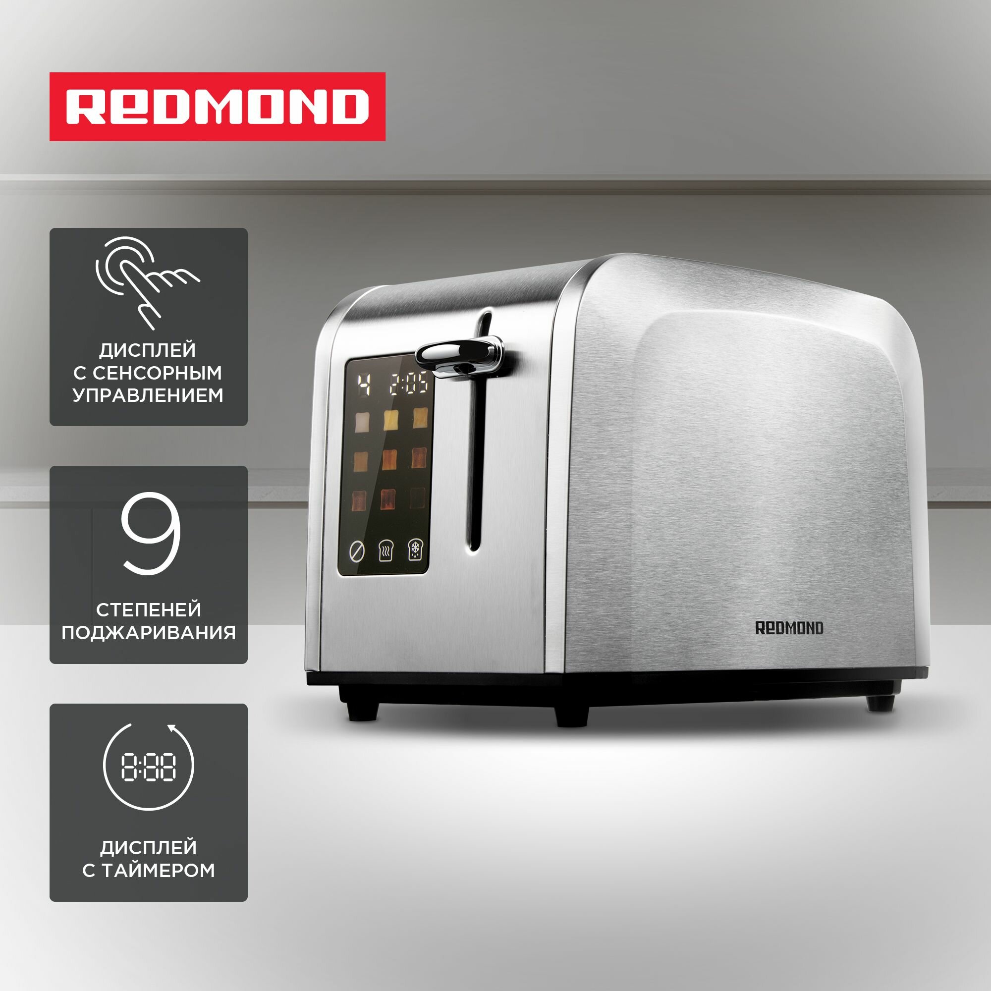 Тостер, 9 степеней прожаривания, REDMOND T903, Серый/металл. информация:
