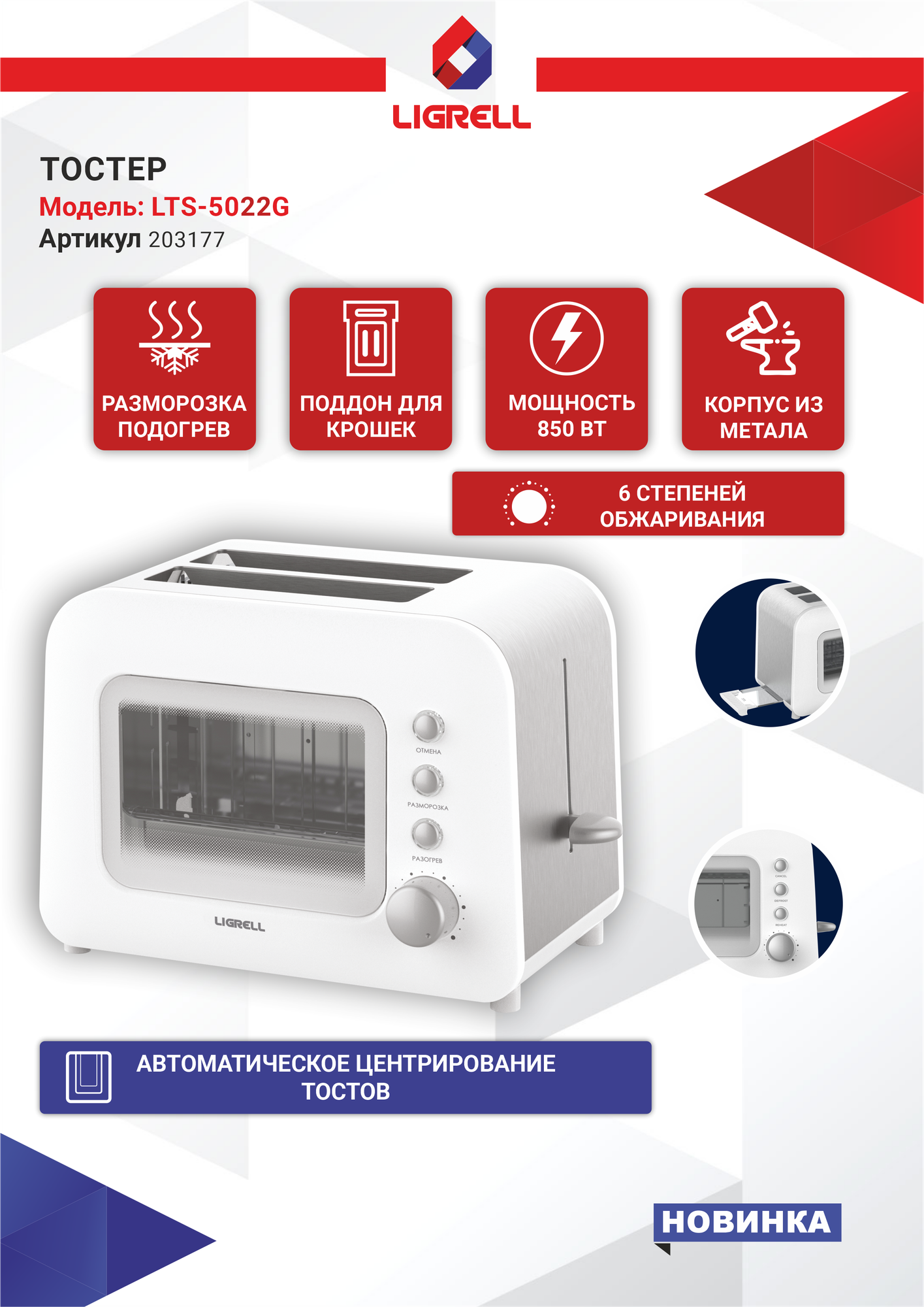 Тостер Ligrell LTS-5022G, пластик/металл, белый, 2 тоста, 850Вт, с дверцей информация:
