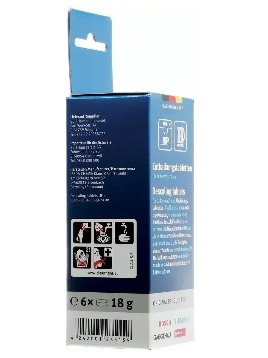 Таблетки для очистки от накипи для автоматических кофемашин Bosch/Siemens/Gaggenau/Neff ( 6 шт.) информация: