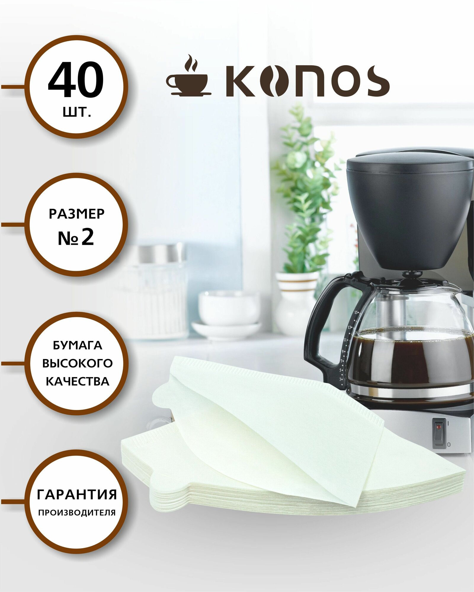 | Комплектация | Фильтры для кофеварки капельного типа, бумажные отбеленные, 40 шт.,бренд: KONOS, арт. KONOS2/40FW |