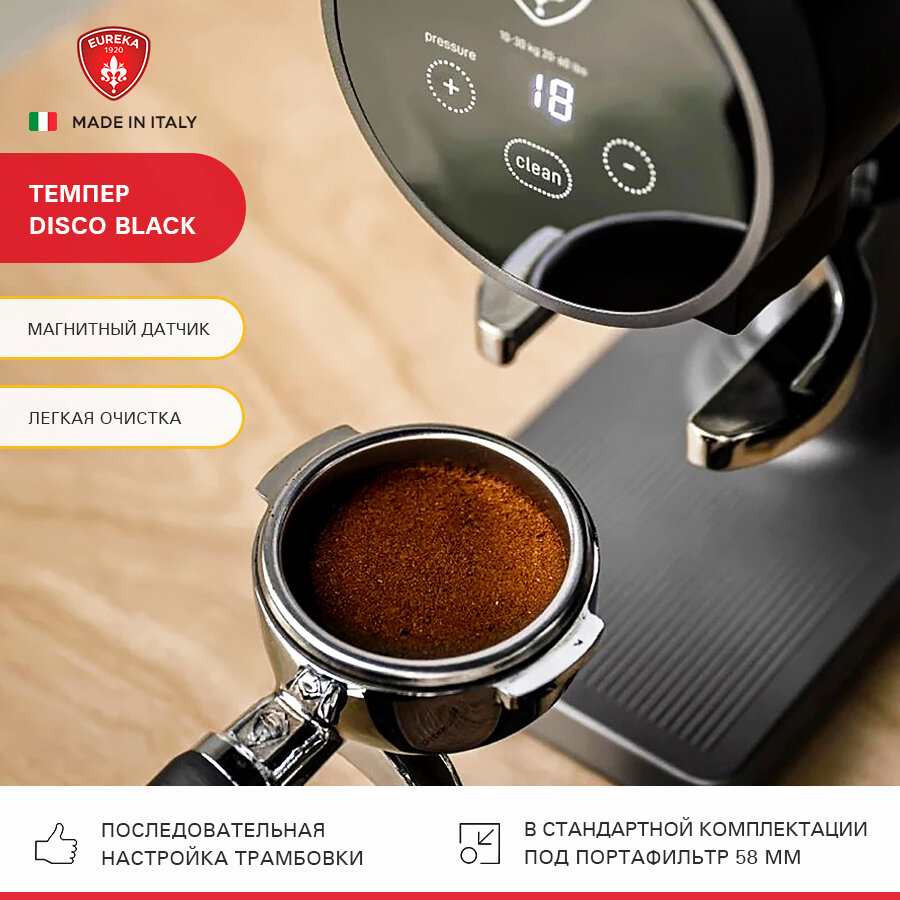 10 цен на Темпер для кофе автоматический Eureka DISCO Black (диаметр 58 мм). Разравниватель для кофе. Пресс для кофемашин