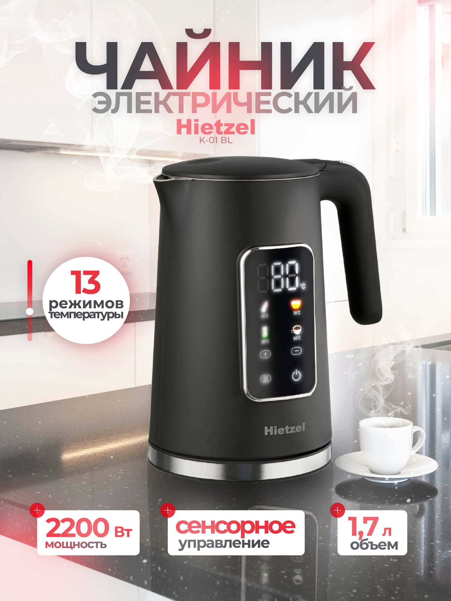 Чайник электрический черный Hietzel K-01 BL, 2200 ВТ, 1,7 л, сенсорный, эффект термоса, с выбором температуры информация: