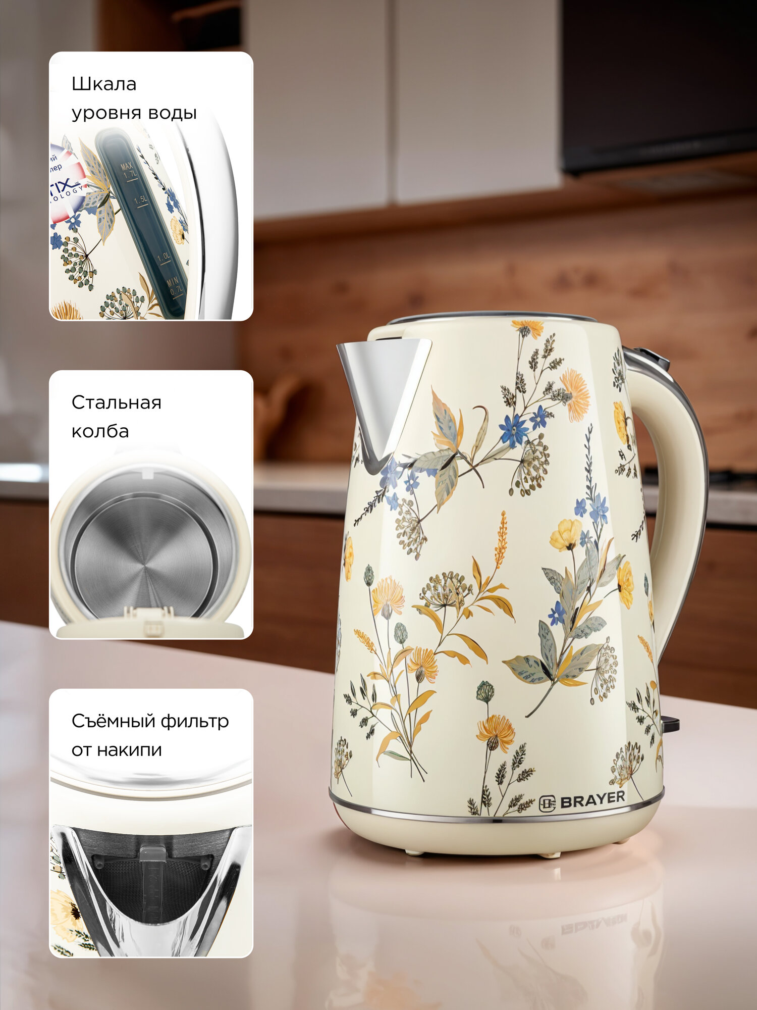 Чайник электрический BRAYER BR1069, 2 литра, 2200 Вт, бежевый