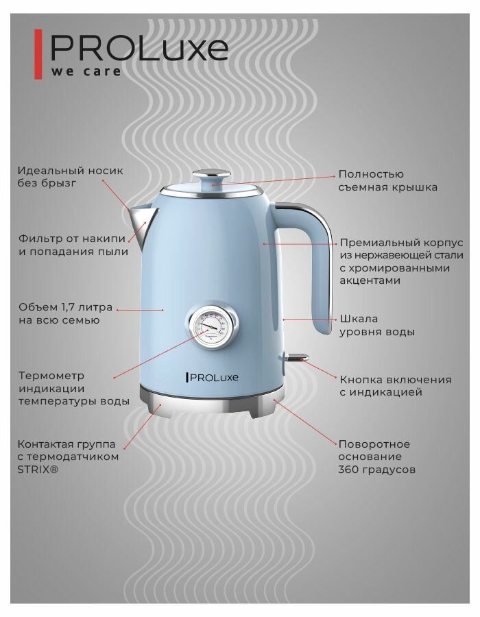 Электрочайник PROLuxe Stylish голубой PL-WKBLU01, Strix,1,7 литра,2400 Вт информация: