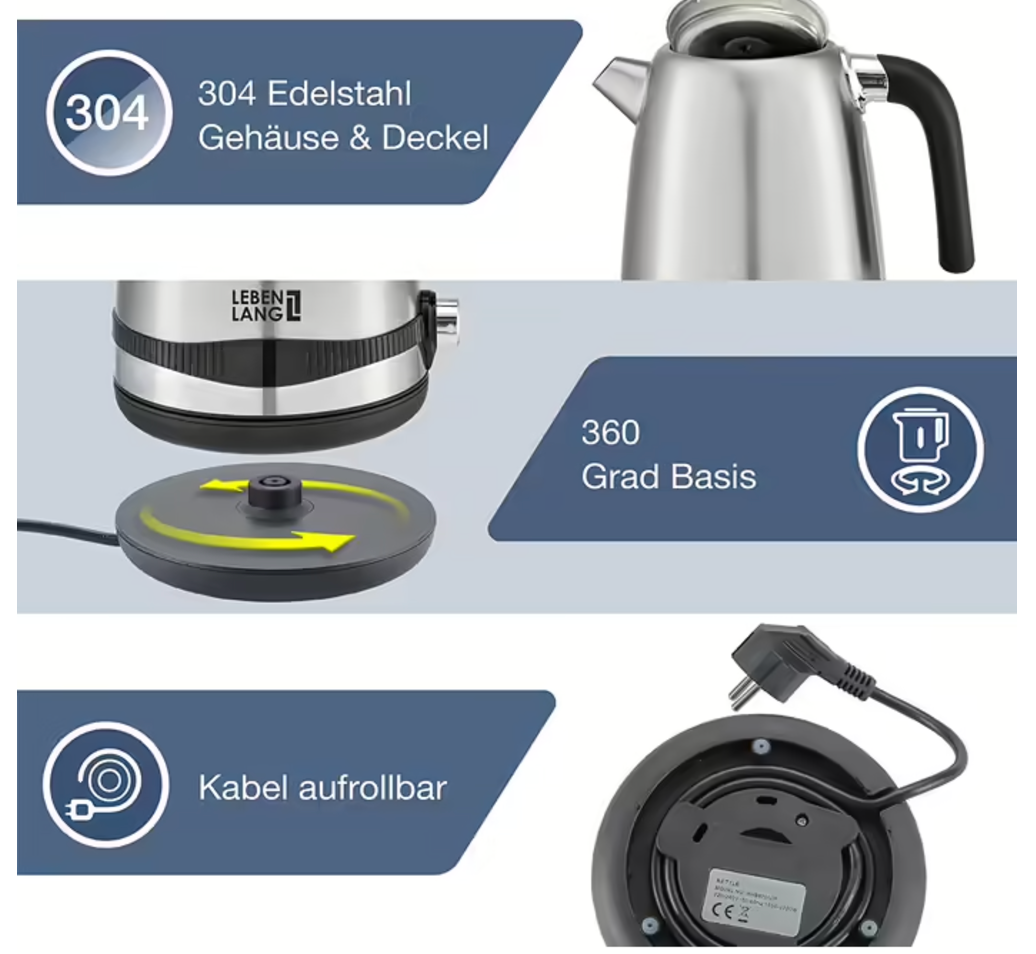 | Особенности | бесшумное закипание / вращение на 360 градусов / двойные стенки / индикатор уровня воды / индикация включения |