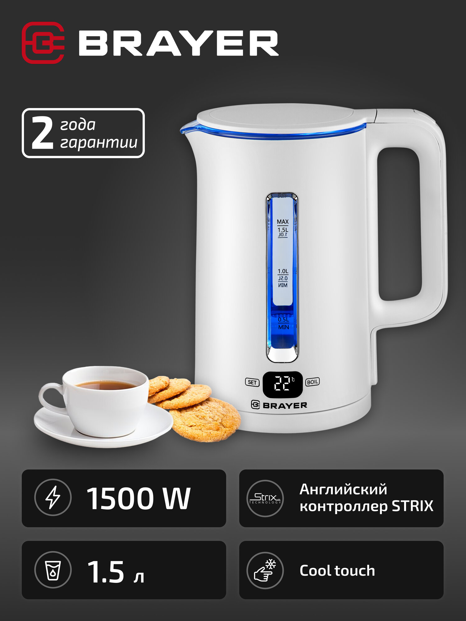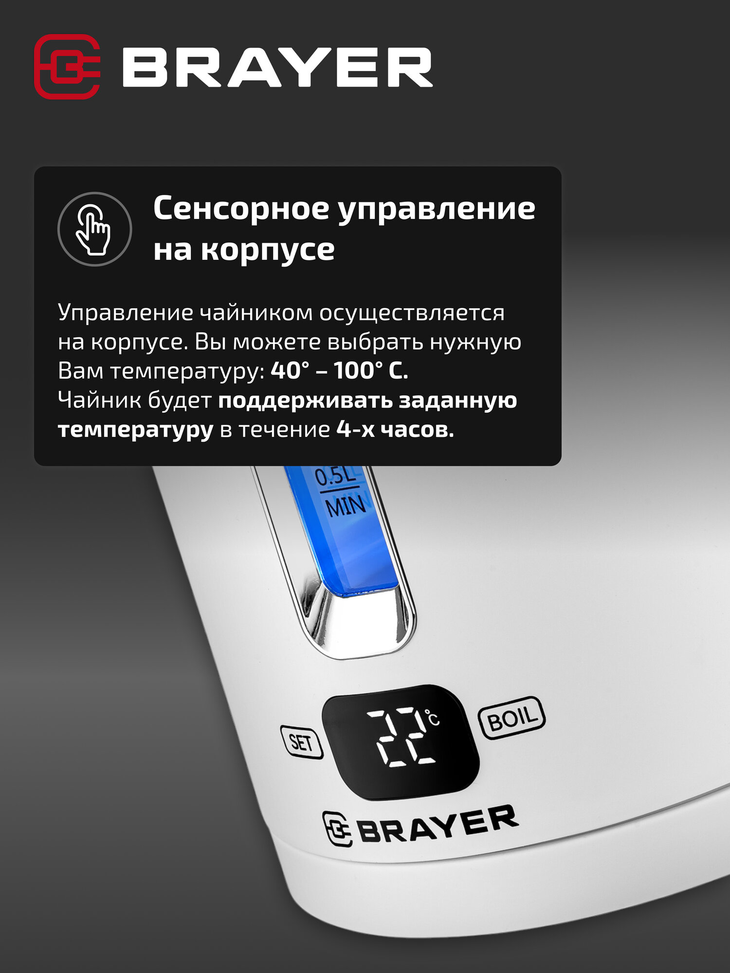 Чайник электрический BRAYER BR6100, Strix, 1500 Вт, 1,5 л, Cool Touch, cенсорное управление информация:
