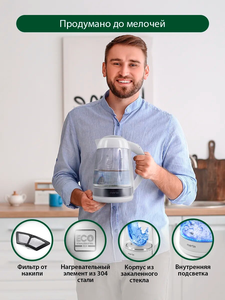 Электрический чайник MARTA MT-4610 белый стеклянный с подсветкой, 1,8 л