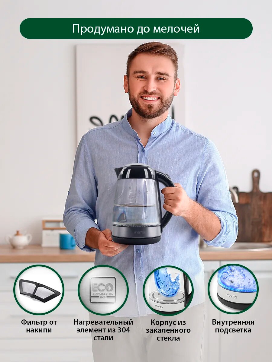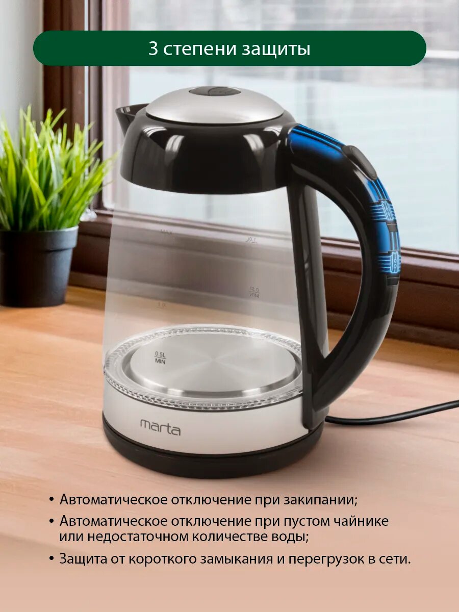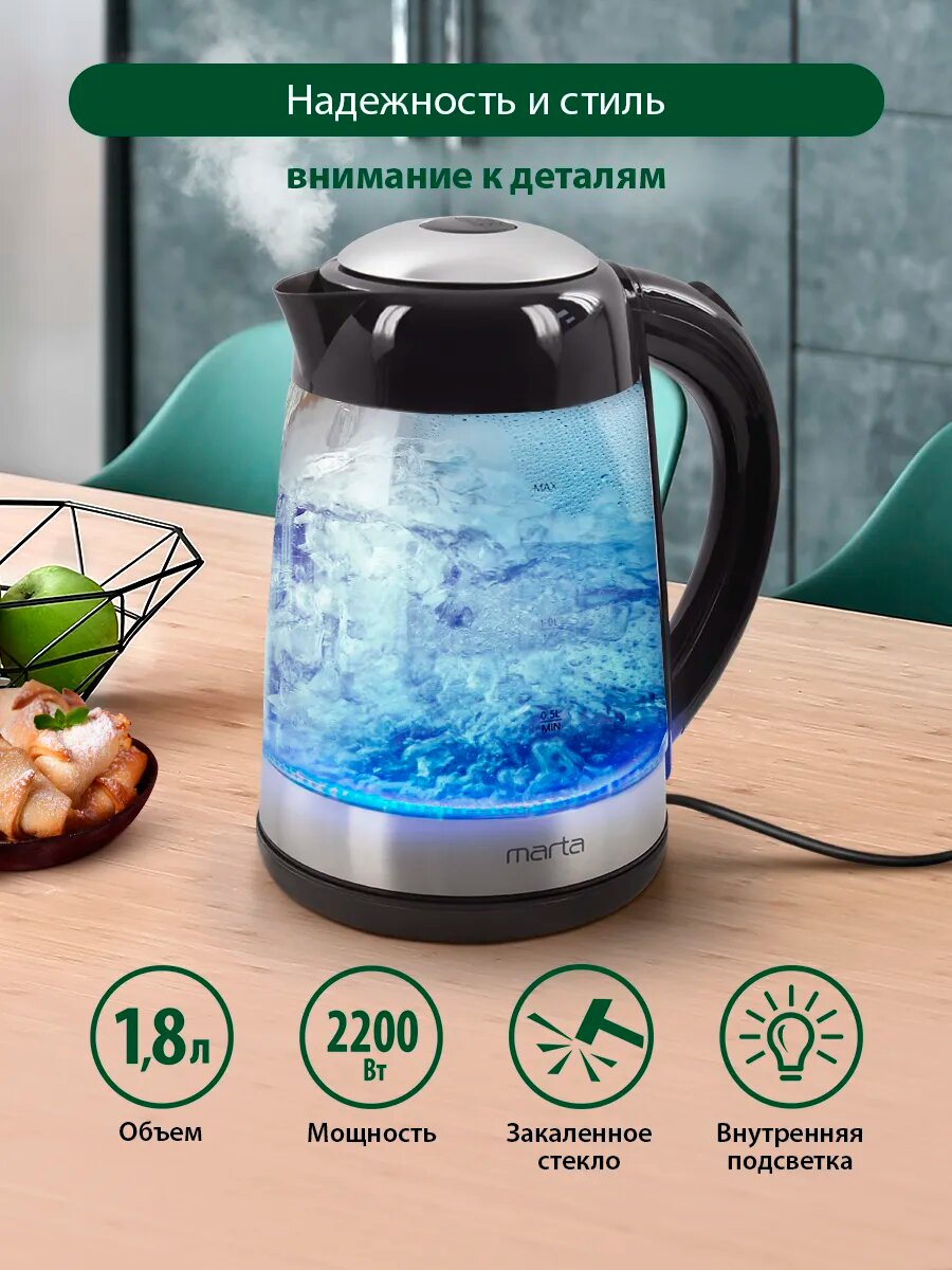 Электрический чайник MARTA MT-KT4655A черный стеклянный с заварником, 1.8 л
