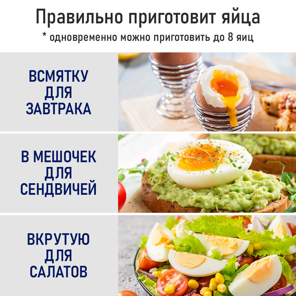 | Дополнительные функции | в мешочек, вкрутую, всмятку, индикация включения, отключение при недостатке воды, пищевой пластик |