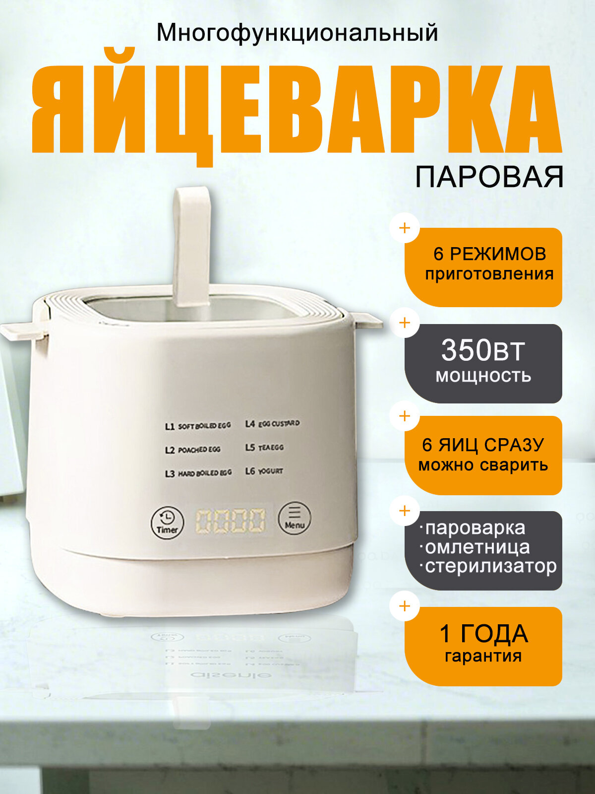 Электрическая яйцеварка 6 в 1; пароварка с таймером; 350 Вт; белый информация: