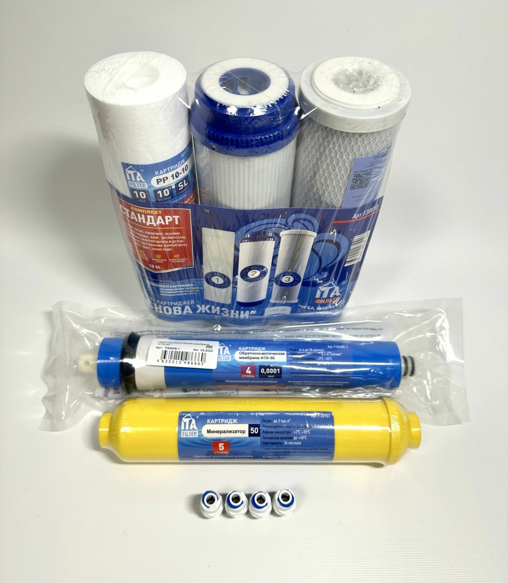 | Комплектация | Данный комплект собран для удобства в использовании, ПОСТАВЛЯЕТСЯ ПОШТУЧНО РОССЫПЬЮ! 1. Сменный картридж для механической очистки (полипропиленовый) - 1 шт. 2. Сменный картридж для удаления солей жесткости (Cation-Anion) - 1 шт. 3. Сменный картридж для комплексной очистки (угольный СТО-10) - 1 шт. 4. Обратноосмотическая мембрана "ИТА-50" - 1 шт. 5. Минерализатор 50 мм. - 1 шт. 6. Фитинг 1/4 - 4 шт. |