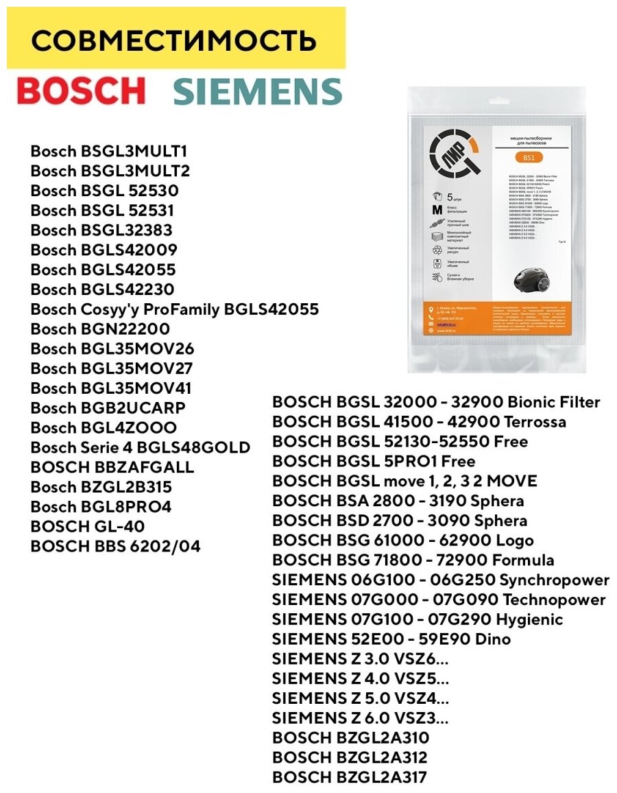 Мешки для пылесосов BOSCH/SIEMENS, синтетические, одноразовые, 5шт. информация: