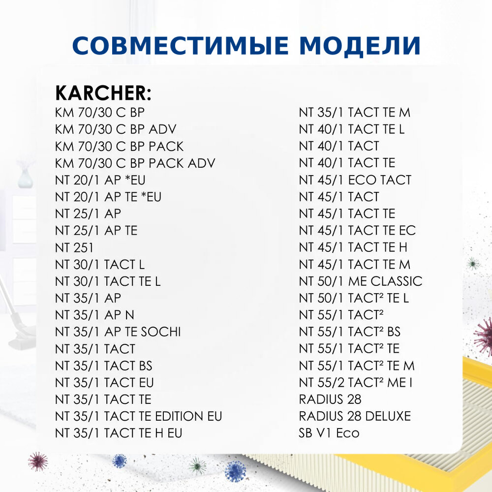 | Совместимые модели | KARCHER KM 70/30 C ADV, KARCHER NT 20/1 AP/TE, KARCHER NT 25/1 AP, KARCHER NT 360 ECO Xpert |