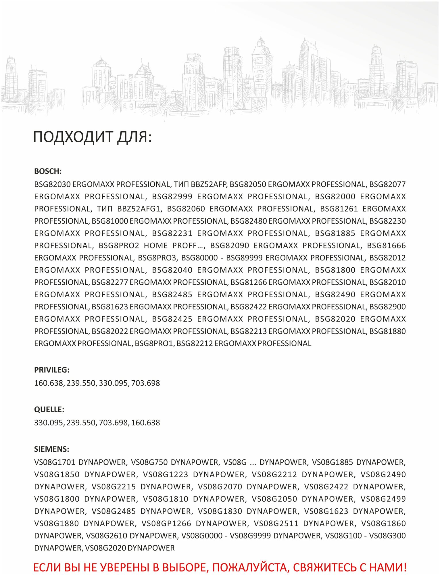 | Производитель совместимого пылесоса | Bosch, Privileg, Siemens |