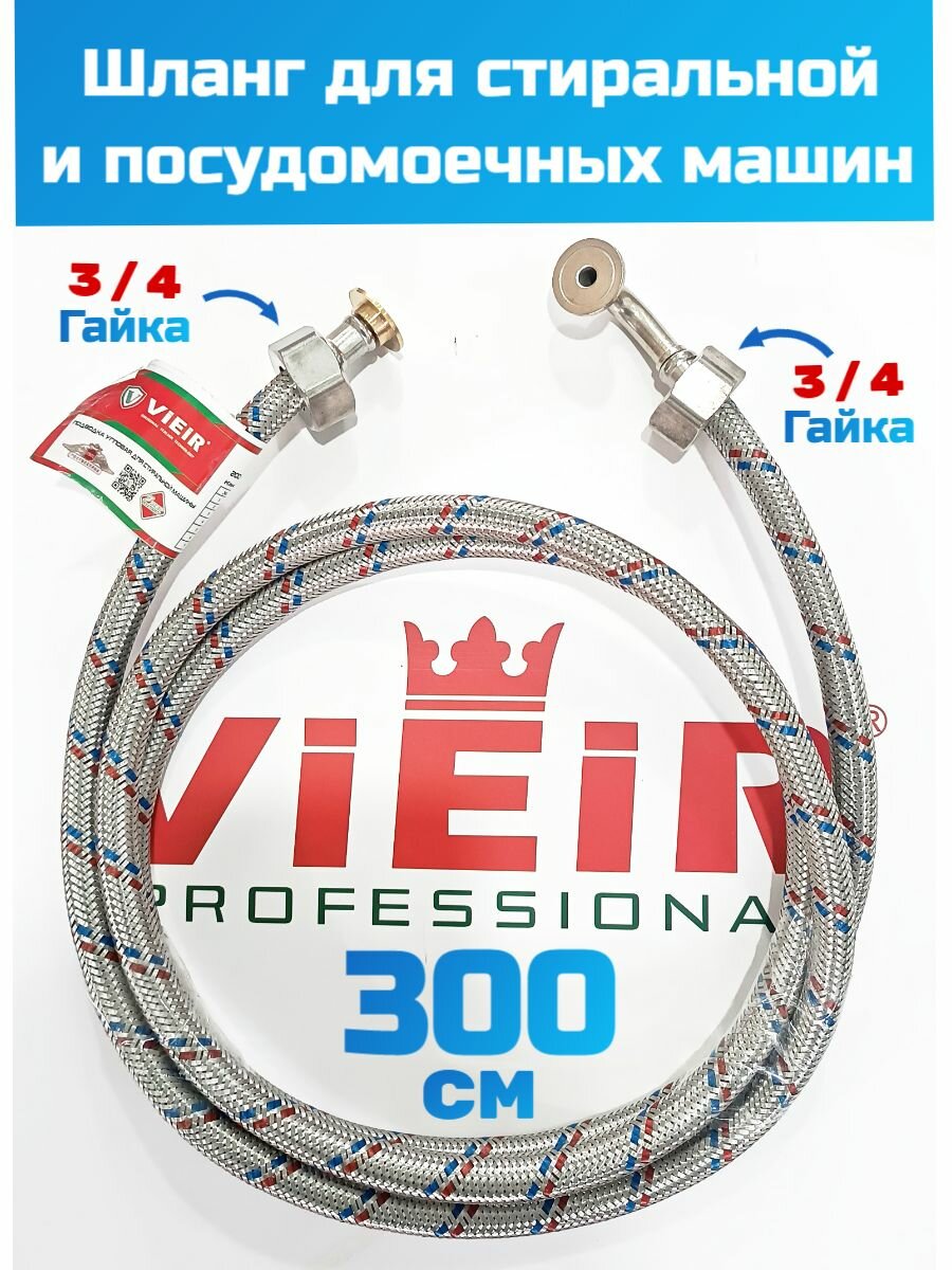 Шланг заливной 3 метра, для стиральных и посудомоечных машин VIEIR, оплётка из нержавеющей стали информация: