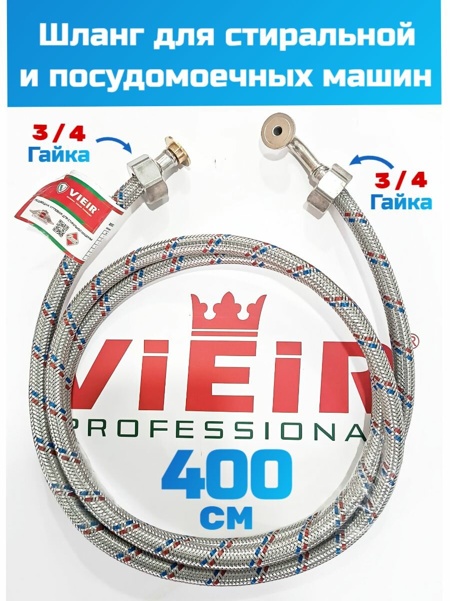Шланг заливной 4 метра, для стиральных и посудомоечных машин VIEIR, оплётка из нержавеющей стали информация: